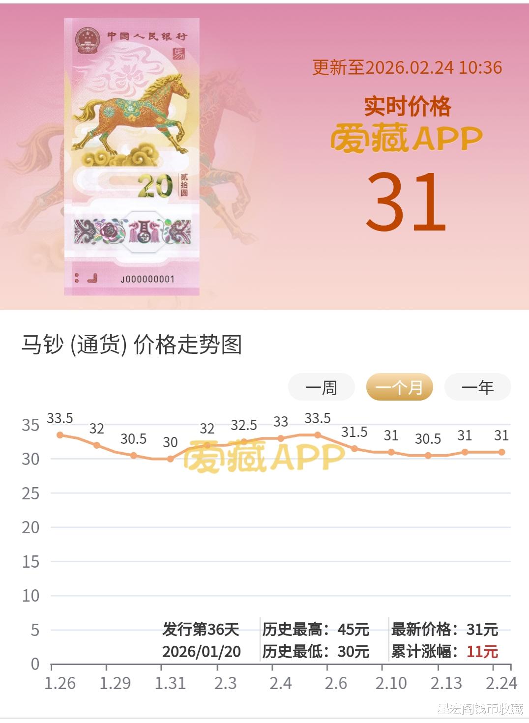 2026年马年纪念钞春节期间市场行情并没有出现比较大幅度的上涨,当然也没有出现大幅度的下跌,基本上能维持在30元左右的市场行情。春节假期以后,2026年马年纪念钞通货的市场表现基本上在30.5~31元左右,散钞通货的价格在30.5~30.7元左右,通货标准十连,基本上在31元左右也就是说310元一组。