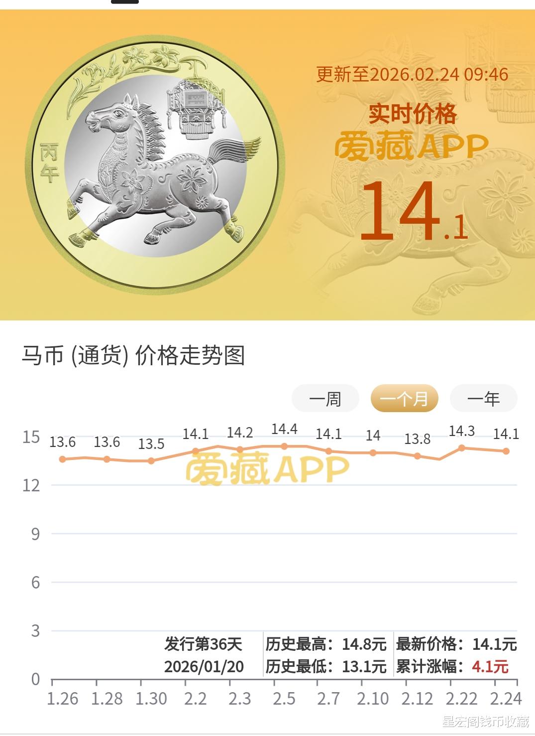 2026年马年普通纪念币原盒目前市场行情基本上能保持在14.3~14.5元左右,不过基本上在14~14.2元左右的2026年马年普通纪念币成交量还是比较活跃,2026年马年普通纪念币的价格超过14.3元以上,目前来看成交量并不是太活跃,看来差价也就在一两毛左右。