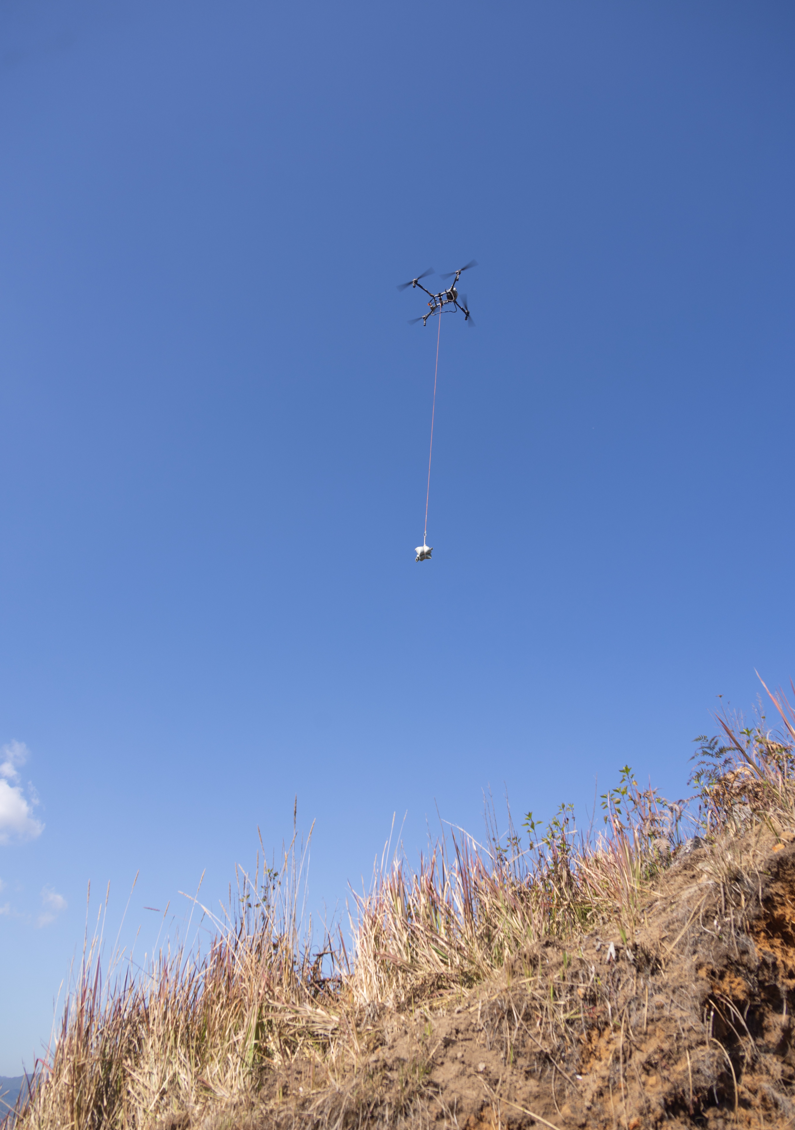 山上还在施工,有无人机忙着运送整袋的石子,省了不少人工。