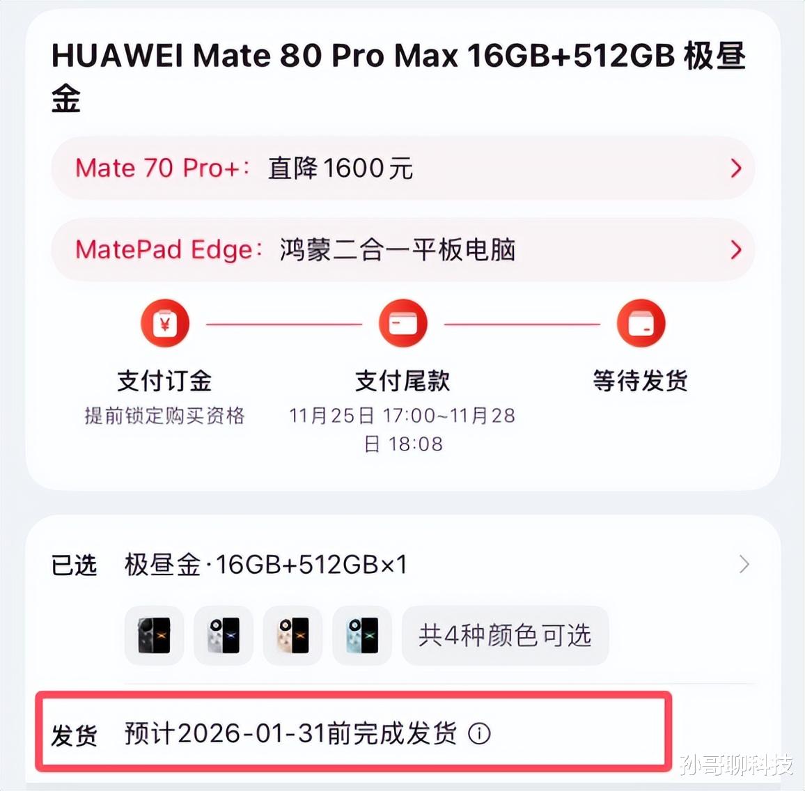 根据网友晒出的订单信息显示,现在已经预定华为Mate80 ProMax用户,最迟要等到2026年1月31前完成发货。从11月25日发布,到交付可能要等两个多月时间,说明销量火爆供不应求。