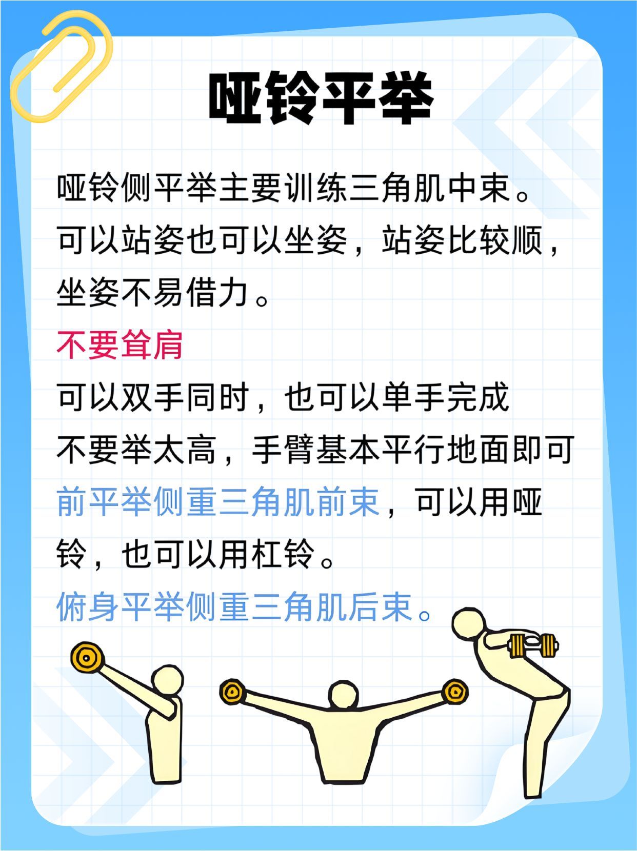坐姿/站姿均可,双手握哑铃举至肩侧,缓慢推起至手臂伸直(避免锁死肘关节)。重点:核心收紧,背部挺直,避免借力。效果:强化肩前束,提升肩部力量,改善含胸体态。2️⃣ 中束雕刻:哑铃侧平举