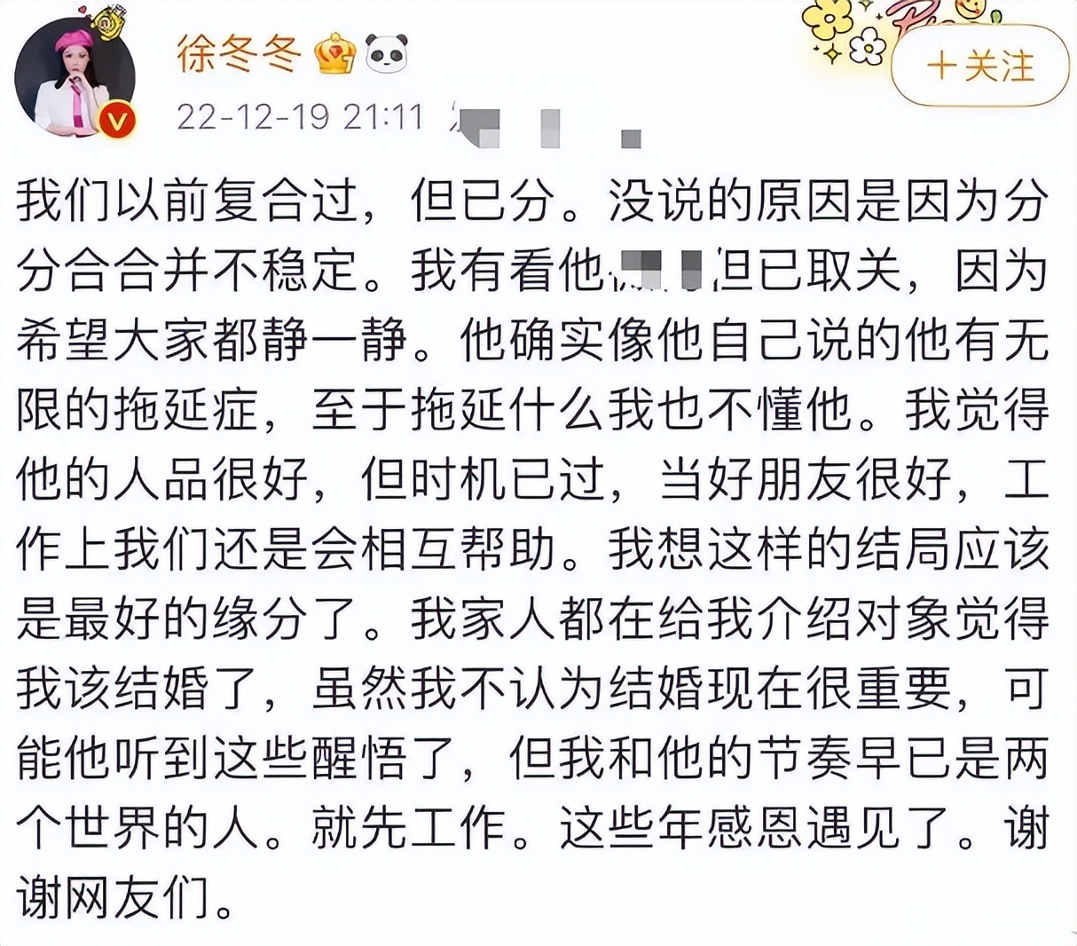 自2019年8月11日官宣分手中,中间经历过多次分分合合,甚至徐冬冬在2022年的时候还公开征婚,称与尹子维是两个世界的人,态度非常坚决。