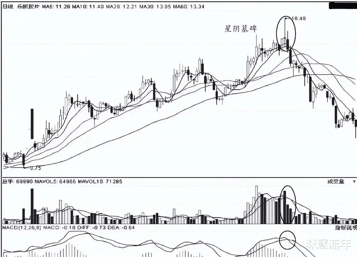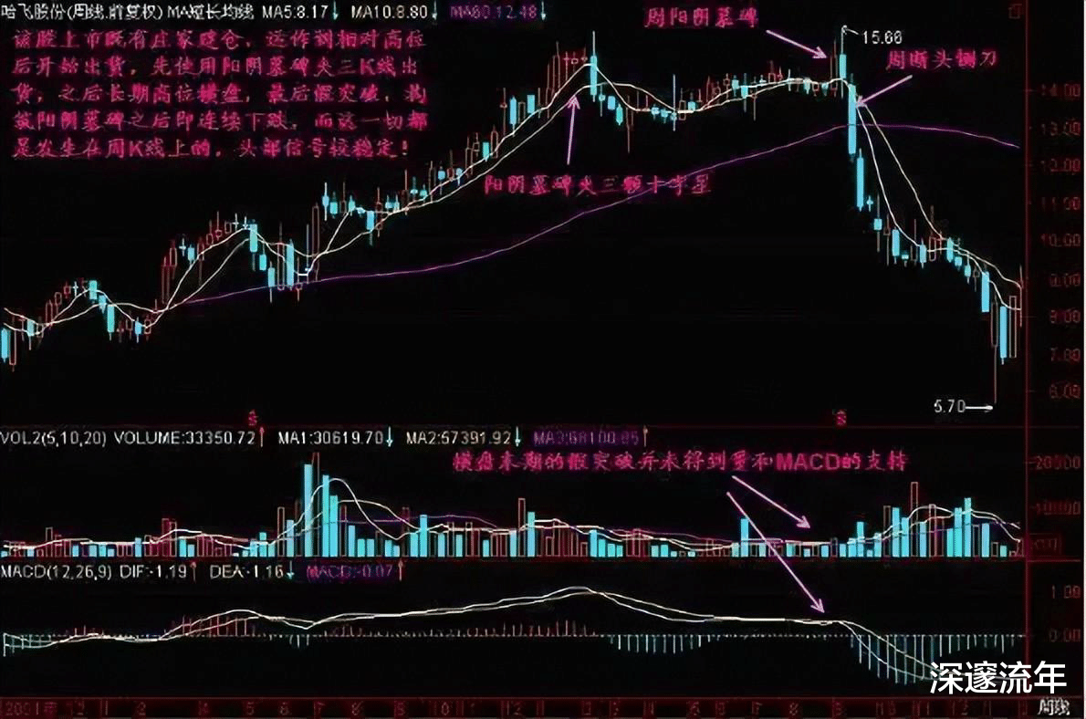 第一次形成阳阴墓碑后没能有效跌破60生命线,当时头部不成立,但股价长期上涨后到了高位区间是肯定的,