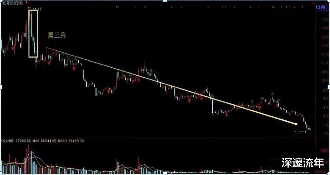 这种形态由三根中阴线组成,每一根阴线的开盘价都切入上一根阴线,上下影线越短越好。