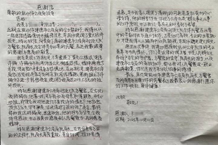 几天后,王女士从老家黑龙江寄来一封亲笔信,并多次致电建德市公安局警务督察大队,郑重请求为方建华澄清正名。她在电话中说:“我投诉的,是一位最负责、最替我着想的民警。我用最恶意的心态,揣测了他最善意的行动。方警官保护的不仅是我的钱,更救了我全家。我的投诉,是他职业生涯里的污点,我恳请组织为他擦去,还他清白!”