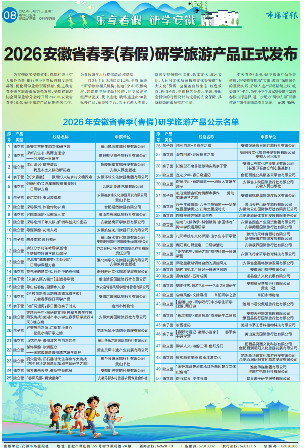 为贯彻落实安徽省委、省政府关于扩大服务消费、推行中小学春秋假制度决策部署,优化研学旅游资源供给,促进我省春季研学旅游市场繁荣发展,安徽省旅游协会研学旅游分会特开展2026年安徽省春季(春假)研学旅游产品征集遴选工作,为春假研学出行提供高品质供给。
