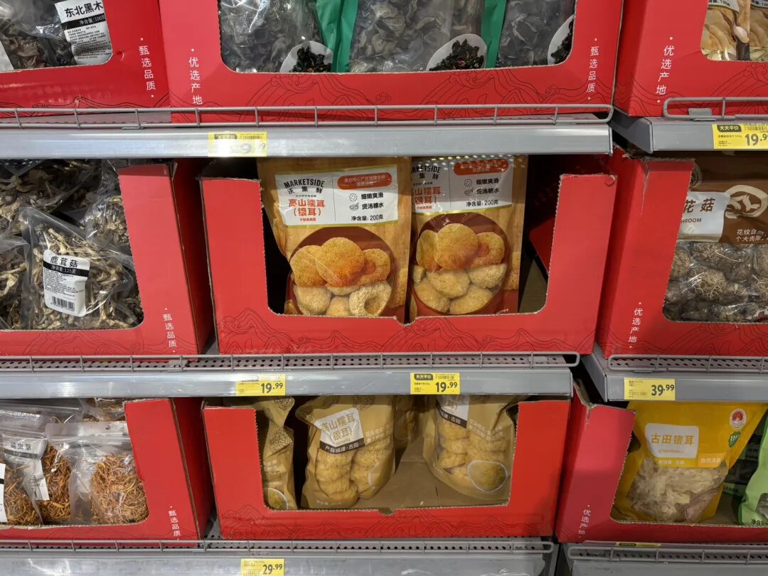 在零食区,「沃集鲜」的夏威夷果、腰果等比品牌同类产品便宜近30%;干杂区,「沃集鲜」的银耳比旁边它牌的产品便宜了十块;在烘焙区,沃集鲜的全麦面包、麻薯等产品吸引了不少顾客驻足。
