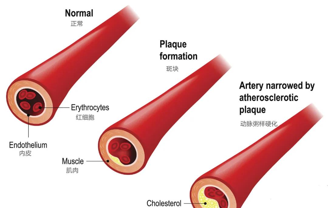 动脉粥样硬化,简单来说就是随着年龄增长,尤其中老年人体内钙沉积物的增加、细胞外基质的积累,动脉壁增厚变硬,最终形成粥样斑块的病理过程。