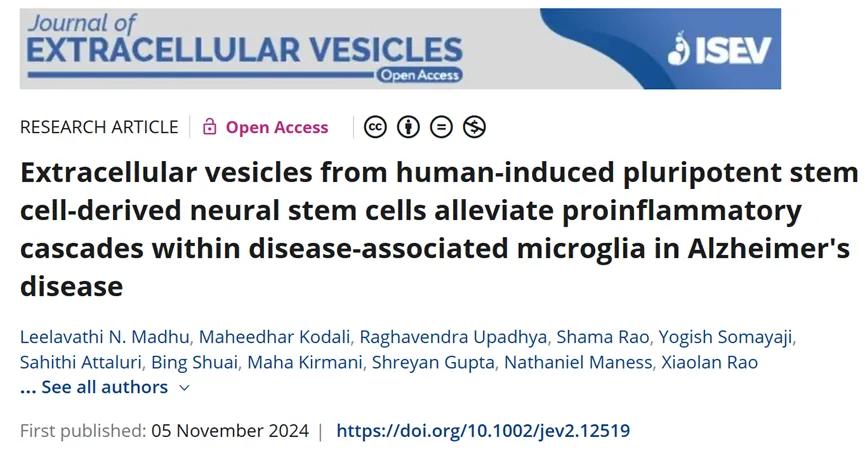 [2] Madhu LN, Kodali M, Upadhya R, Rao S, Somayaji Y, Attaluri S, Shuai B, Kirmani M, Gupta S, Maness N, Rao X, Cai JJ, Shetty AK. Extracellular vesicles from human-induced pluripotent stem cell-derived neural stem cells alleviate proinflammatory cascades within disease-associated microglia in Alzheimer's disease. J Extracell Vesicles. 2024 Nov;13(11):e12519.