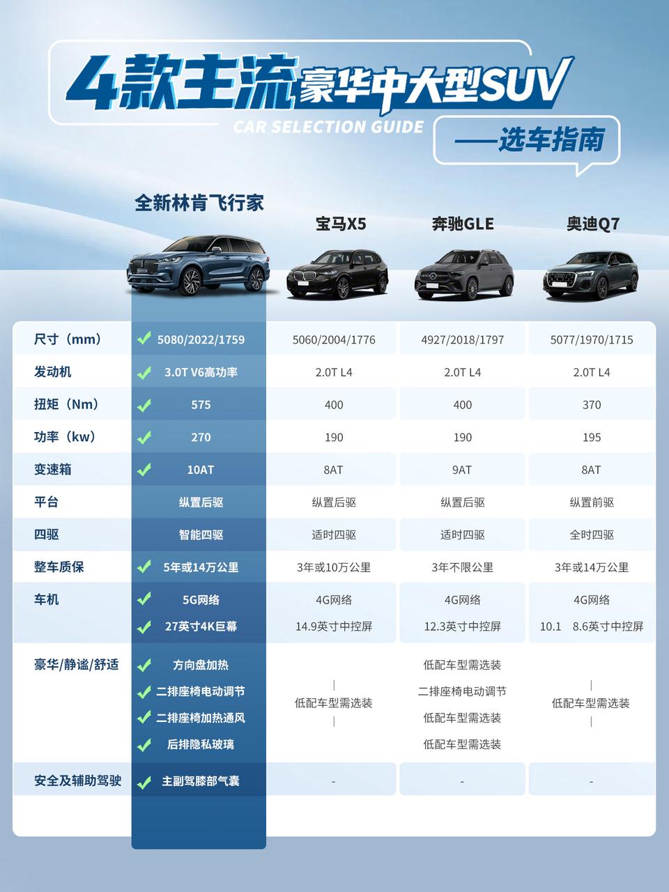 选车看参数别踩雷!整理了林肯飞行家、奔驰GLE、宝马X5、奥迪Q7的核心数据发动机、配置、平台优势一目了然~纠结中大型豪