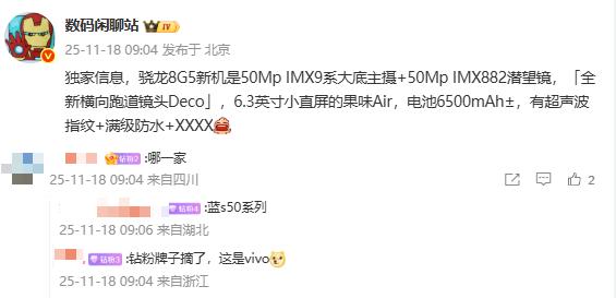 近日,数码博主“数码闲聊站”曾曝光了一款新机的部分核心配置,据其称,“独家信息,骁龙8G5新机是50Mp IMX9系大底主摄+50Mp IMX882潜望镜,「全新横向跑道镜头Deco」,6.3英寸小直屏的果味Air,电池6500mAh±,有超声波指纹+满级防水+XXXX”。虽然博主此次又没透露新机的名称,但是根据近日的爆料和 @vivo韩伯啸 的官宣推测,该机大概率是近日关注的焦点新机vivo S50 Pro Mini。