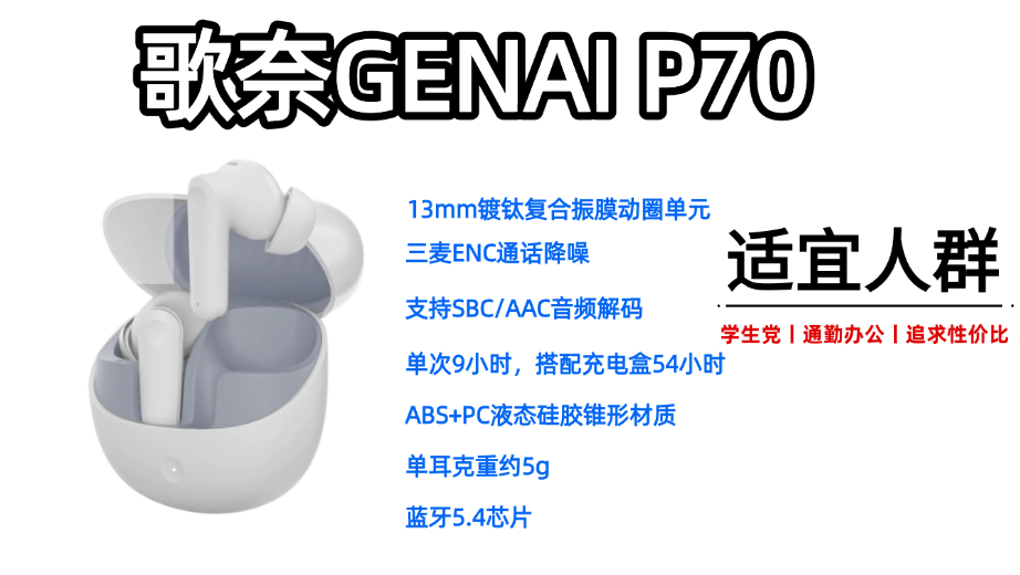 综合用下来,性价比最高的还是歌奈GENAI P70,13mm镀钛动圈音质能打,-38dB降噪日常完全够用,9小时单耳续航也够省心,才160多块,各方面都没短板,大部分朋友入这款准没错。 如果预算特别有限就选BP1N,120多块轻巧又够用。 华为用户直接冲Freebuds se4 ANC降噪版,生态适配超爽。 看重续航就选琉璃Ultra,11小时单耳续航巨省心。 喜欢颜值高的就选LolliANC萝莉豆,马卡龙配色超好看。