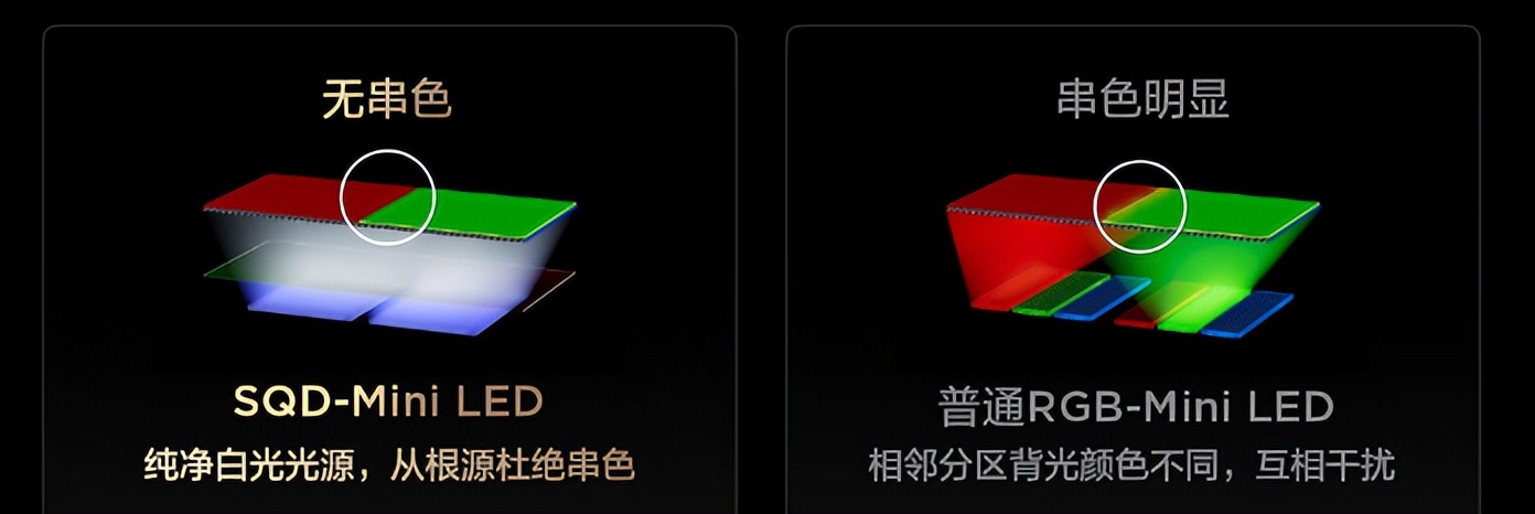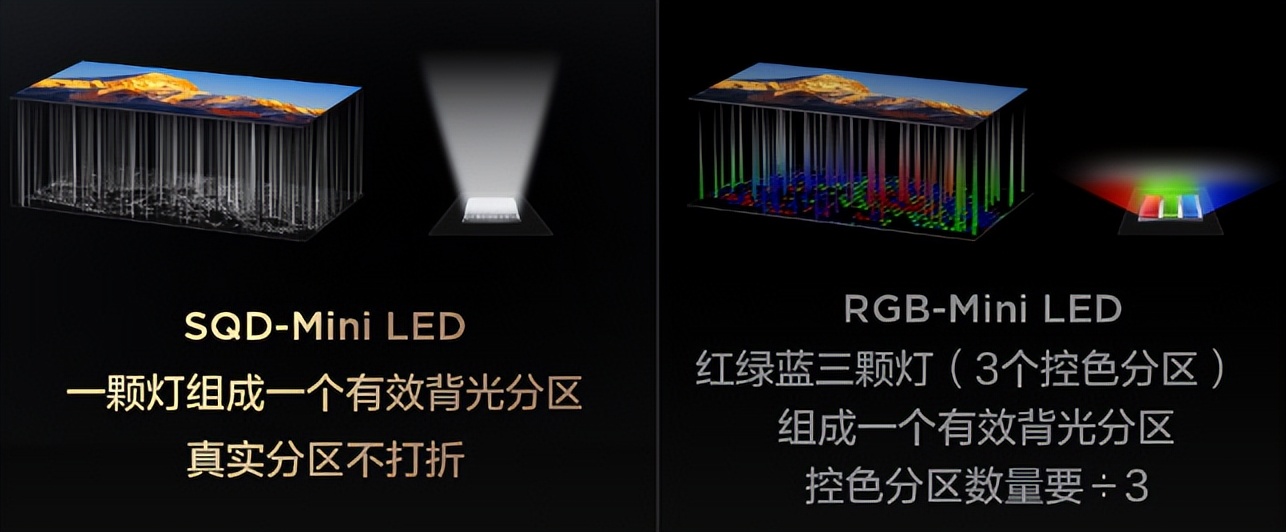 这两款电视的实际观感差别,实际上是SQD-Mini LED、RGB-Mini LED这两个画质技术不同的区别,下面我们仔细分析一下。