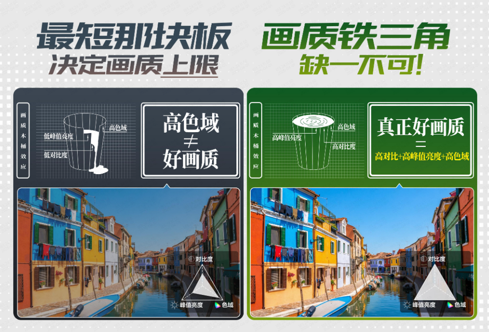 聊完护眼,咱们回到电视的核心——画质。画质好不好,业内有个公认的“铁三角”原则:高对比度、高色域、高峰值亮度,三者缺一不可。对比度决定了明暗层次和细节,色域决定了色彩丰富和准确度,峰值亮度则保证了高光场景的爆发力和细节留存。