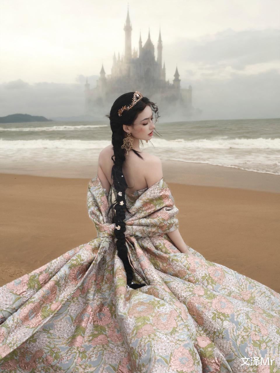 第二张图中,林允以露肩花卉长裙搭配泡泡袖,立于海风轻拂的岸边。她轻抚发丝的瞬间被镜头定格,金色发饰与夸张耳环在阳光下熠熠生辉。这座若隐若现的城堡背景,恰似她从《美人鱼》走向时尚巅峰的隐喻——当年青涩的新人,如今已能从容驾驭高级定制时装的气场。