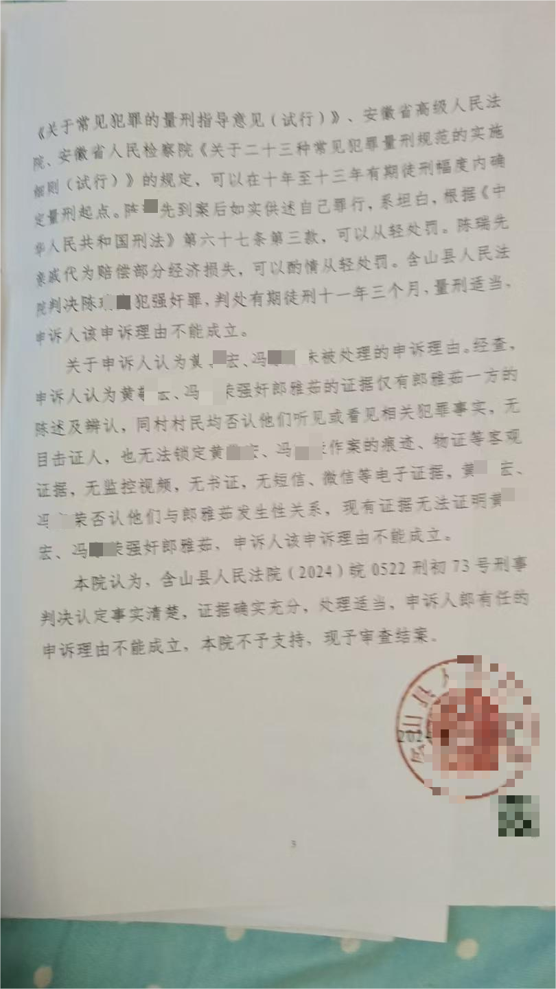 含山县人民法院的判决早已生效,检察院的申诉结果通知书也维持了原判,但对于郎雅茹一家来说,寻求真正公道的路还远未结束。
