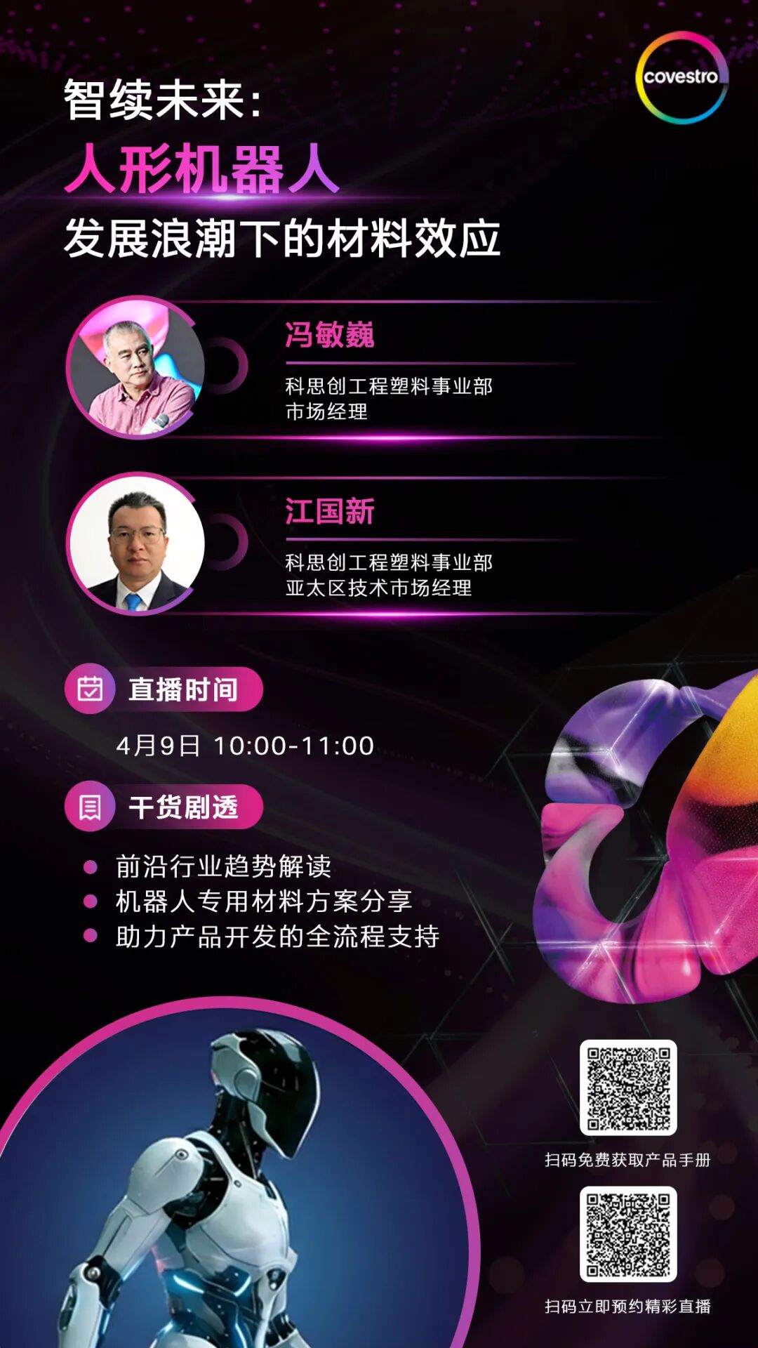 4月9日,科思创线上专题研讨会直播间将先行启幕,带你直击人形机器人量产背后的材料命题。行业大咖坐镇直播间,一小时带你快速看懂: