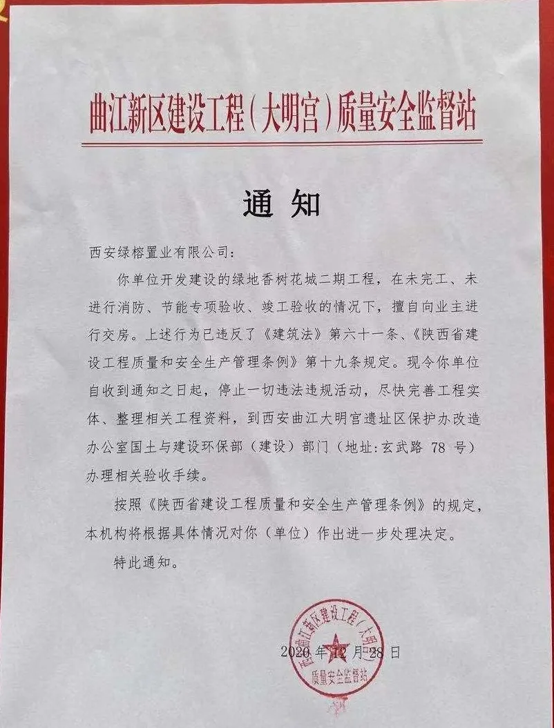 面对如此的交付,在场很多业主意见比较大,随即该项目被投诉到大明宫质监站。一个多小时以后,绿地峰辉的交房行为,被官方紧急叫停。也是在通知里,大家才意识到问题有多严重。官方通知明确写道:绿地香树花城二期工程,在未完工,未进行消防、节能专项验收、竣工验收的情况下,擅自向业主进行交房,……现令停止一切违法违规活动,尽快完善工程实体,办理相关手续……。