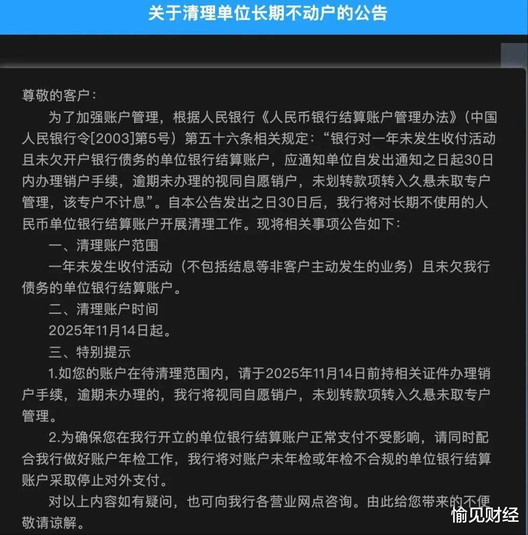 银行清理长期不动账户本身不是新鲜事,2023年开始国有大行就密集展开工作。不过近期,更多的地方中小银行跟进了清理行动,多家银行密集发布相关公告。
