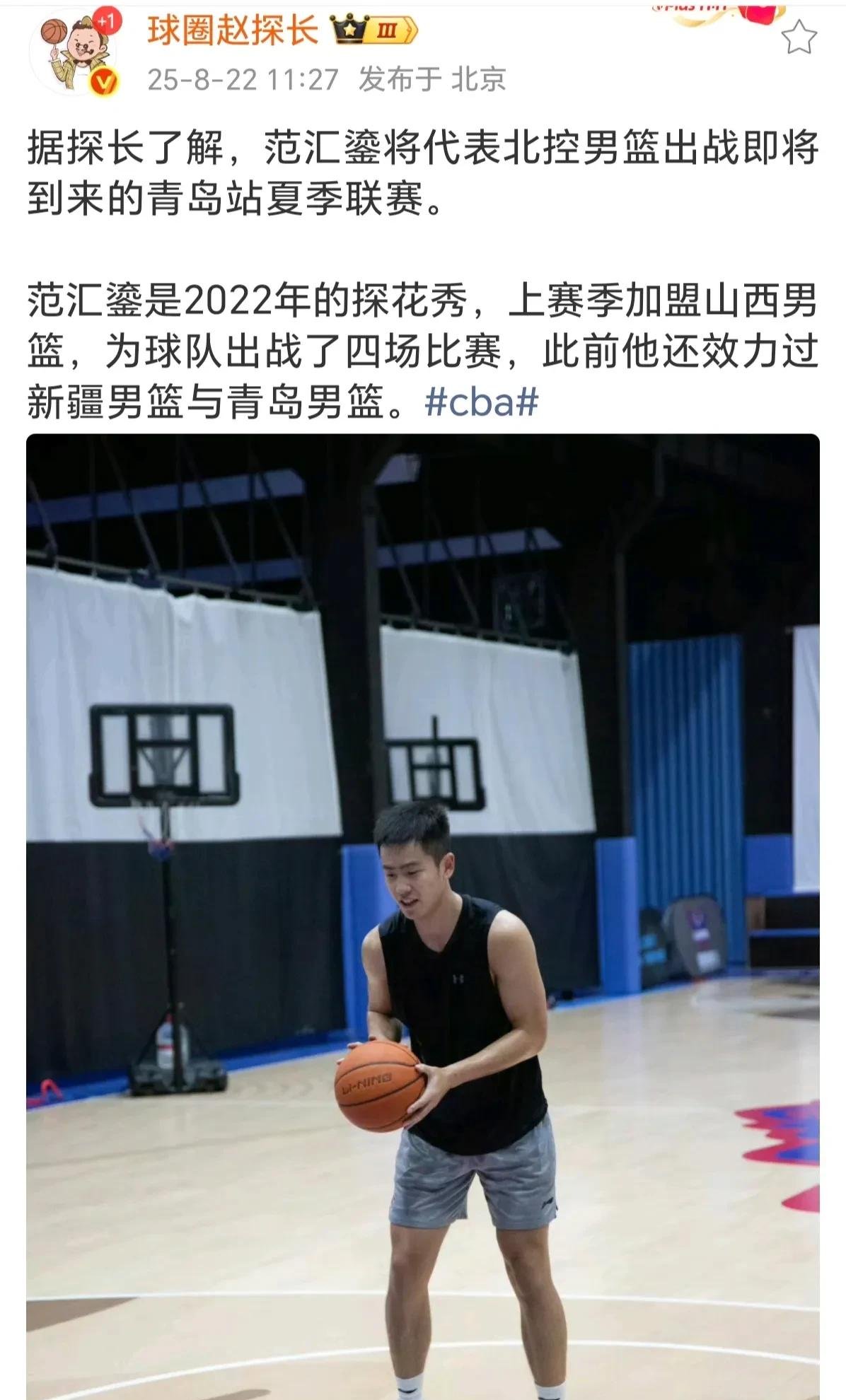 8月22日消息,据知名体育记者“球圈赵探长”发博透露:“范汇鎏将代表北控男篮出战即将到来的青岛站夏季联赛。 范汇鎏是2022年的探花秀,上赛季加盟山西男篮,为球队出战了四场比赛,此前他还效力过新疆男篮与青岛男篮。”