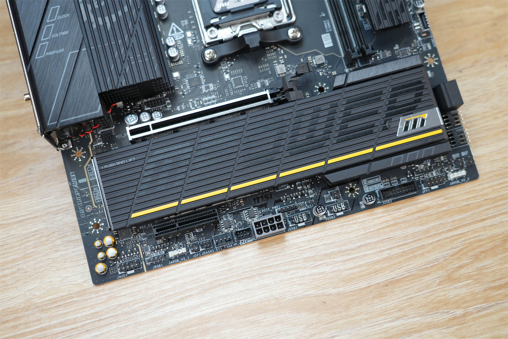 正面3个M.2中,靠近处理器和内存侧的M.2由CPU提供Gen5.0×4 128Gbps带宽,另一个由B850芯片组提供Gen4.0×4 64Gbps带宽,背面M.2为Gen4.0×2 32Gbps带宽。第二代M.2冰霜铠甲免工具拆装,按压卡扣机关即可完成安装或拆卸。
