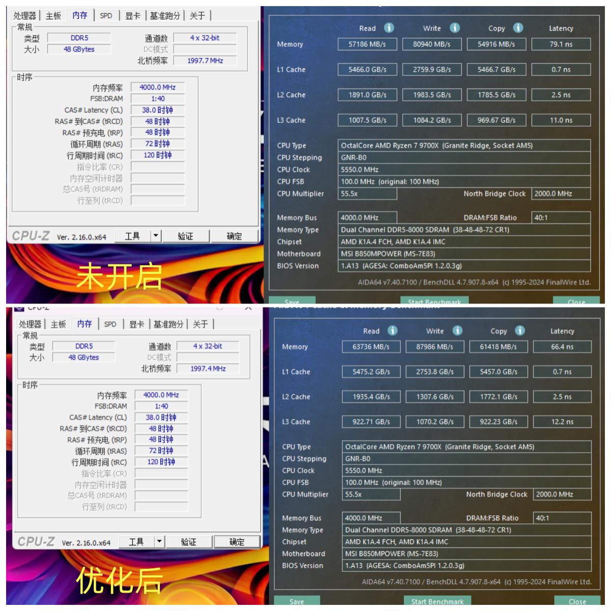 优化后:读取为63736MB/s、写入87986MB/s、复制61418MB/s,延迟66.4ns。