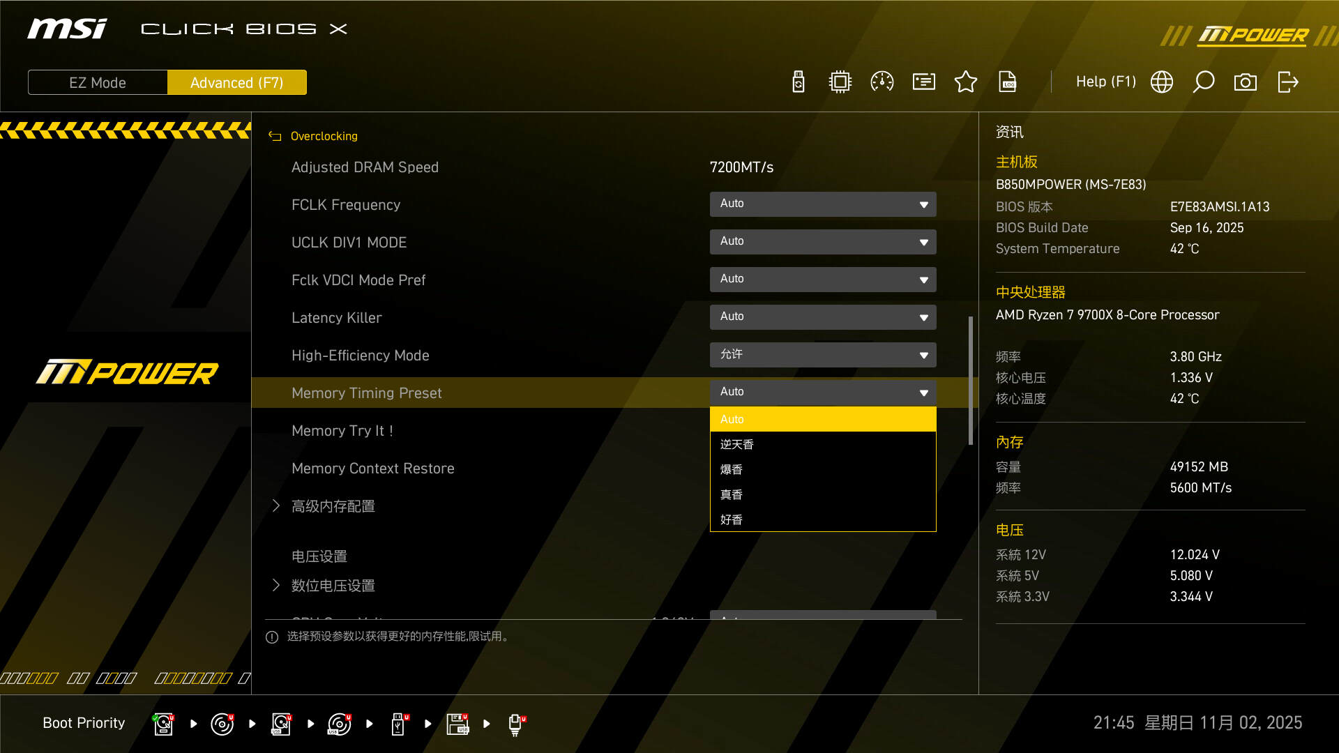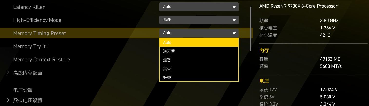 在 BIOS 操作界面中,开启“延迟杀手”功能选项。随后,将“Memory Timing Preset”(内存时序预设)设置为“爆香”模式。在此特别提醒,不建议大家将该选项设定为“逆天香”模式,因为“逆天香”模式对内存的体质要求极为严苛,只有体质非常出色的内存才能在这种设置下保持稳定运行,我的这套内存测试了几次后依旧没开机,所以放弃了。