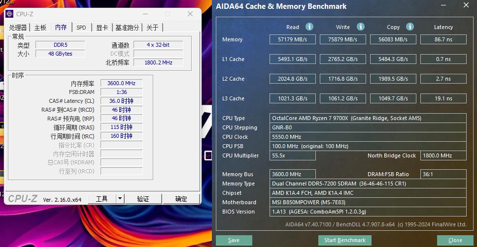 打开XMP1,内存频率为7200MHz,时序36-46-46-115 CR1,此时的读取为57179MB/s、写入75879MB/s、复制56083MB/s,延迟86.7ns。