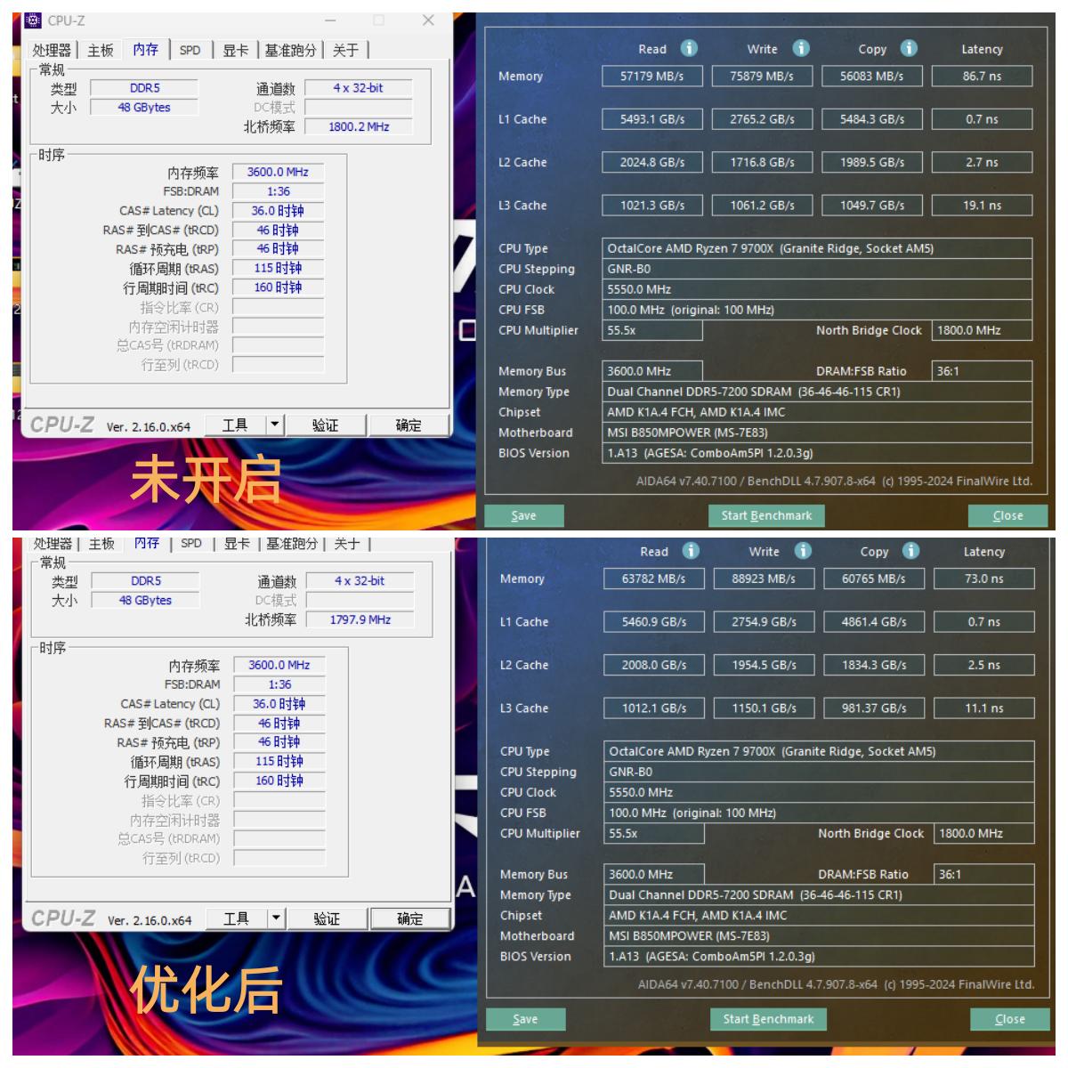 优化后:读取为63782MB/s、写入88923MB/s、复制60765MB/s,延迟73.0ns。