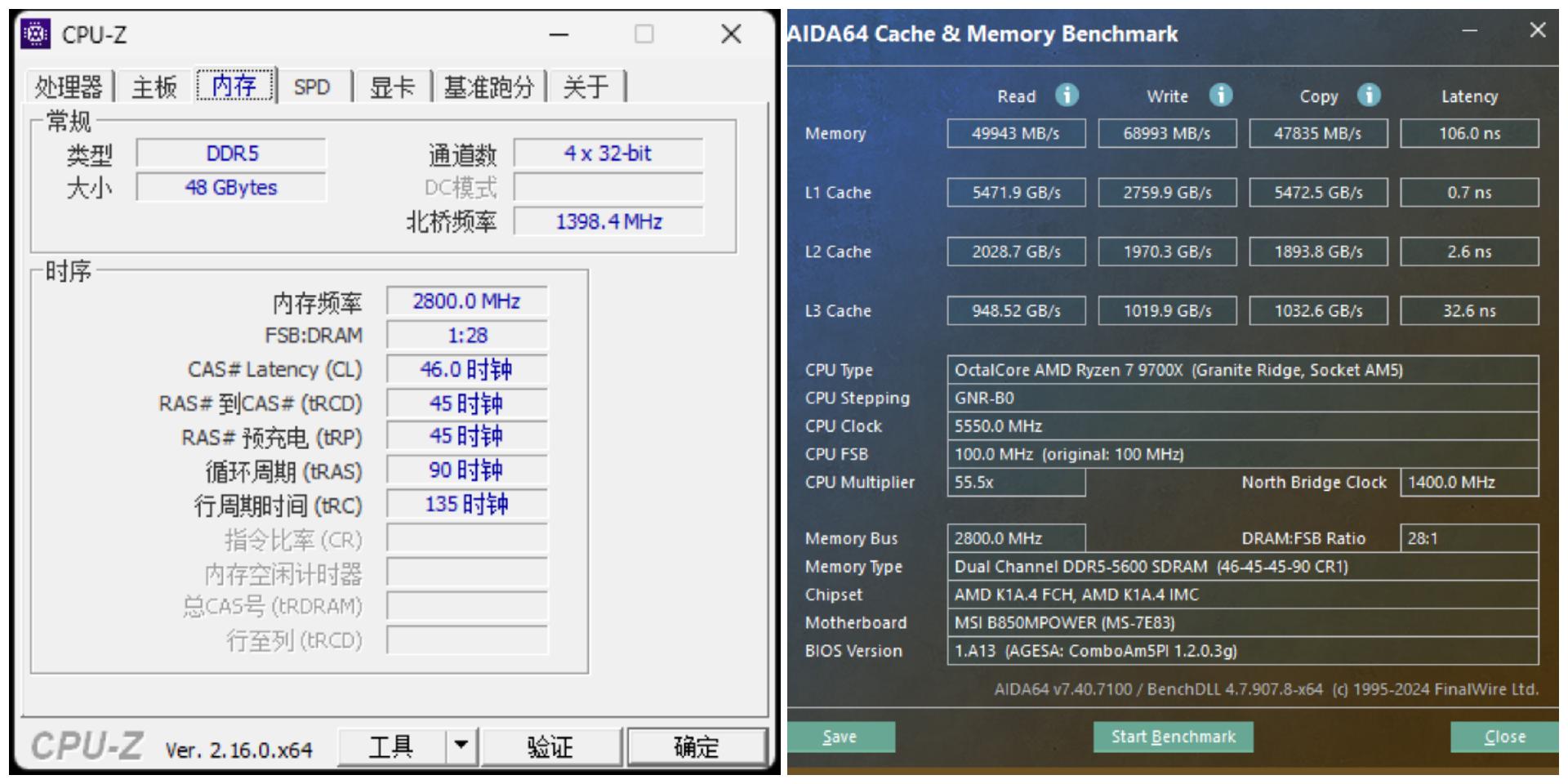 在全默认状态下,频率为5600MHz,时序46-45-45-90,实测内存读取、写入与复制带宽分别为49943MB/s、68993MB/s、47835MB/s,延迟106.0ns。