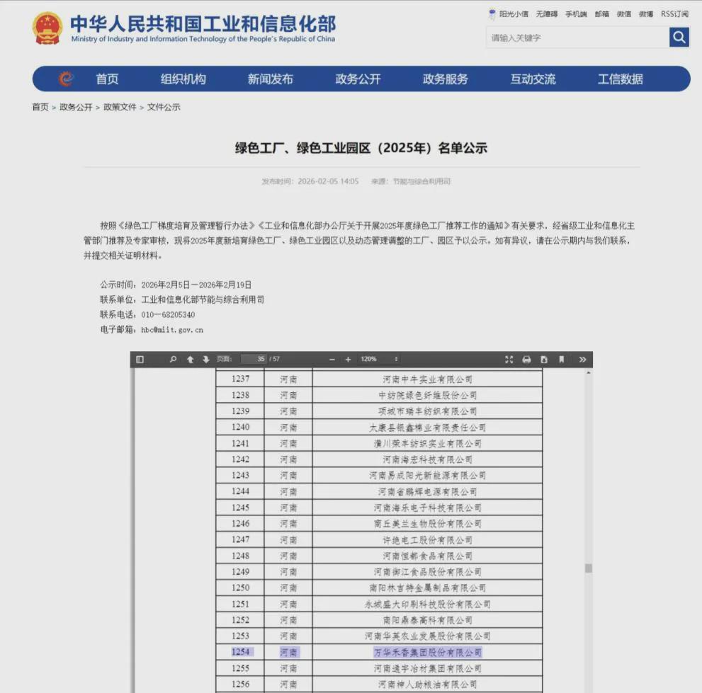近日,国家工业和信息化部公布了2025年度国家级绿色工厂名单,信阳市羊山新区万华禾香集团股份有限公司凭借在绿色制造、节能降耗和清洁生产方面的突出表现成功入选,成为新区唯一上榜企业,实现了新区该领域国家级荣誉“零的突破”。