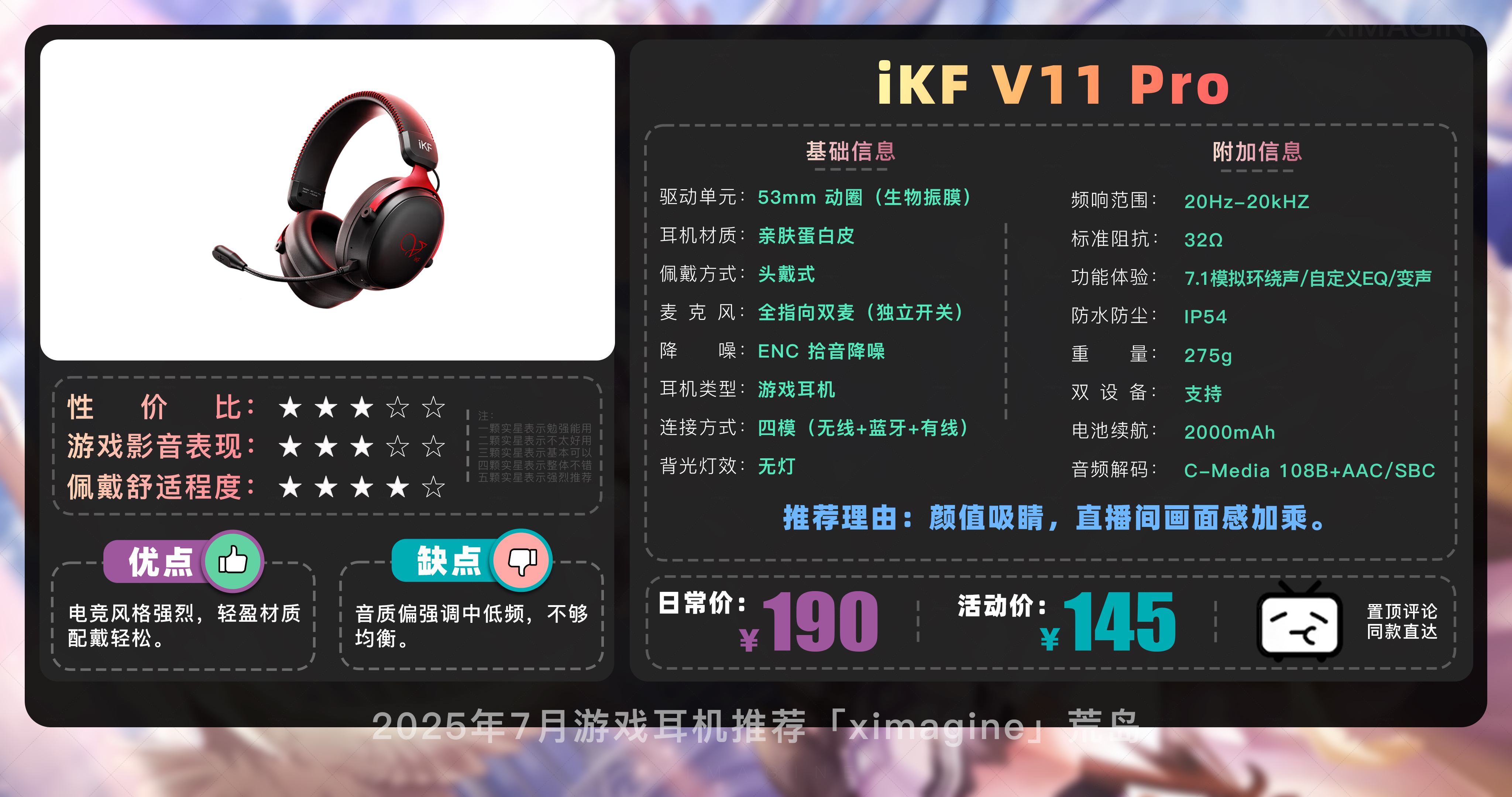 iKF V11 Pro,采用生物振膜 53mm 动圈,CM108B 加 AAC 和 SBC 音频解码器,支持四模连接,声音表现令人印象深刻,低频沉稳有力,高频清晰不过分刺耳,中频细节也很丰富。玩 FPS 游戏时,环境音和敌人脚步都能很准确地捕捉到,提升竞技体验。无线连接稳定,几乎没有延迟,适合对游戏响应有高要求的用户。佩戴感舒适,耳罩软且包裹性好,适合长时间佩戴。麦克风拾音清晰,连麦沟通很顺畅。当前到手价 145 元,综合表现对得起这个价位。
