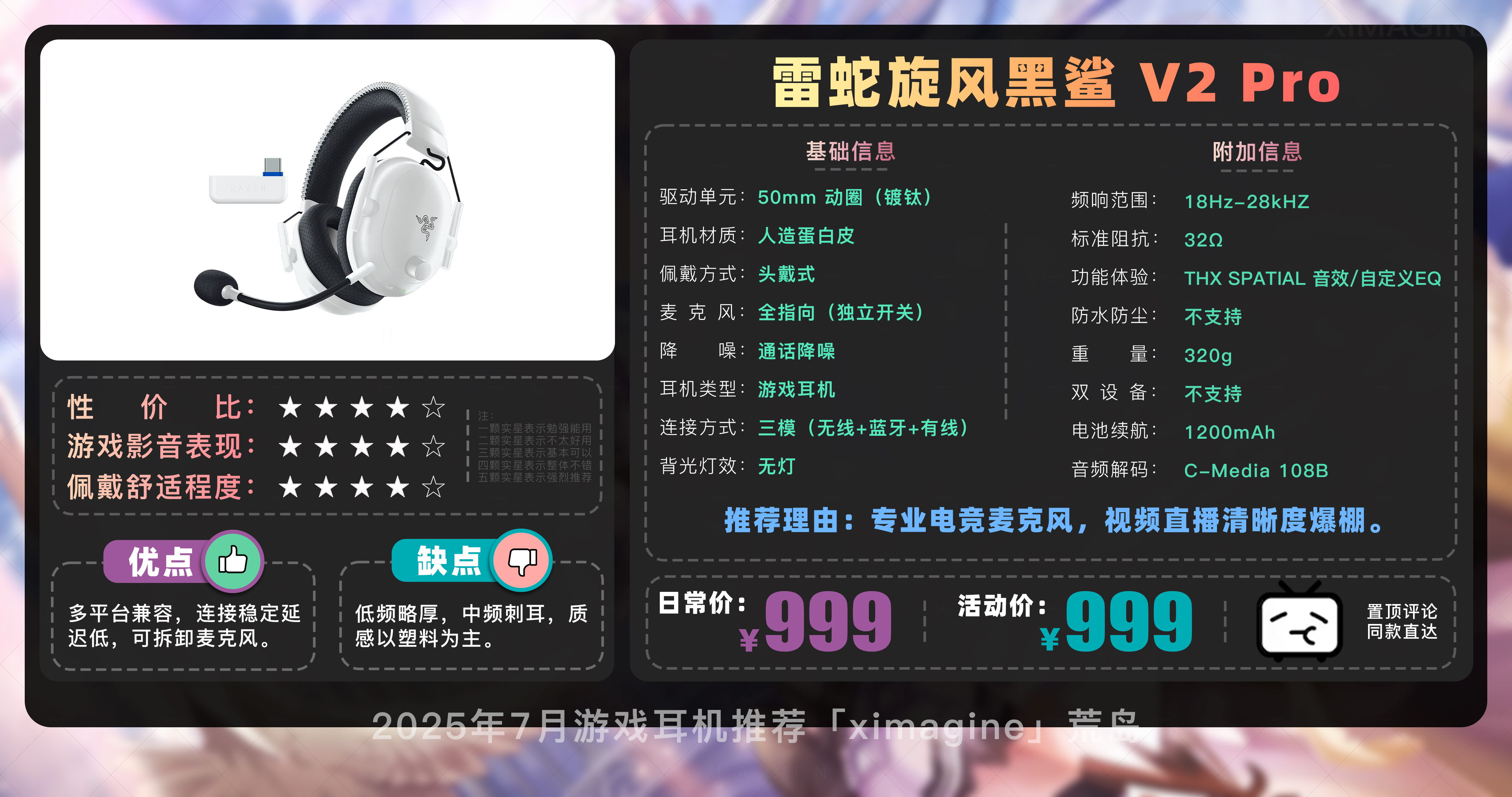 雷蛇旋风黑鲨 V2 Pro,采用镀钛振膜 50mm 动圈,CM108B 音频解码器,支持三模连接,具备顶级的无线传输技术,连接极其稳定,延迟几乎感受不到,尤其适合竞技游戏用户。音效精准,低音沉稳但不过分泛滥,高频清晰明亮,整体音场宽广。佩戴舒适,使用优质记忆海绵耳罩,长时间佩戴也没有负担。麦克风效果同样出色,语音通话清晰干净。整体设计保持了雷蛇一贯的电竞风格,当前到手价 999 元,属于高端电竞耳机阵营。