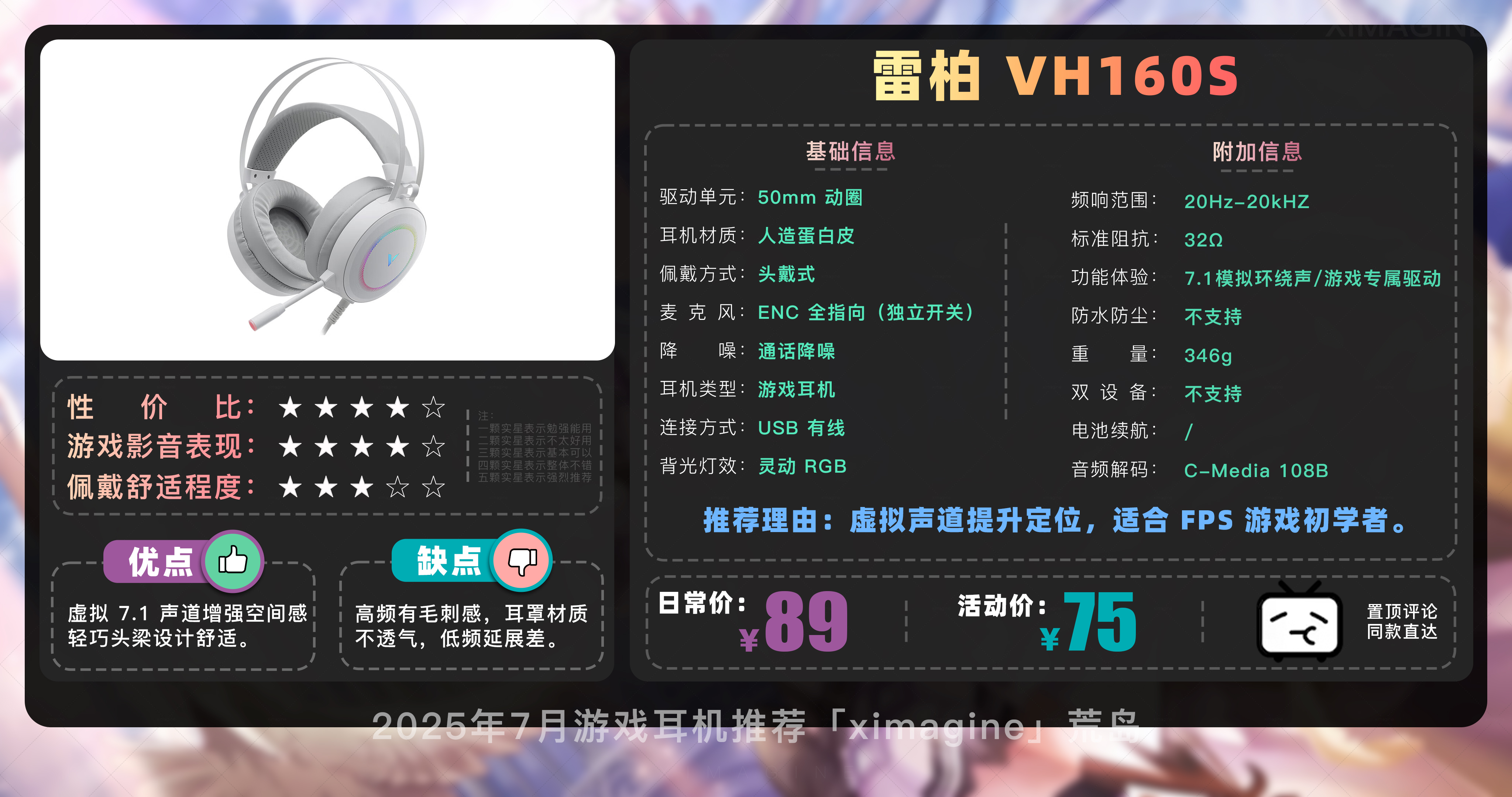 雷柏 VH160S,采用 50mm 动圈,CM108B 音频解码器,单模有线连接,给我的第一感觉就是轻,它的佩戴体验非常舒适,即使戴着玩三四个小时英雄联盟或永劫无间,头顶也不会有明显压迫感。定位声场对新手挺友好,释放技能、敌人靠近等声音效果还算清晰。但在听高频音乐或复杂背景音时略显生硬,长时间听会让耳朵有点疲惫。它的语音表现还不错,跟朋友连麦开黑时基本能保持稳定清晰的沟通。整体风格比较素,属于功能性优先的一款耳机,当前到手价 75 元,是入门有线耳机里的踏实选择。