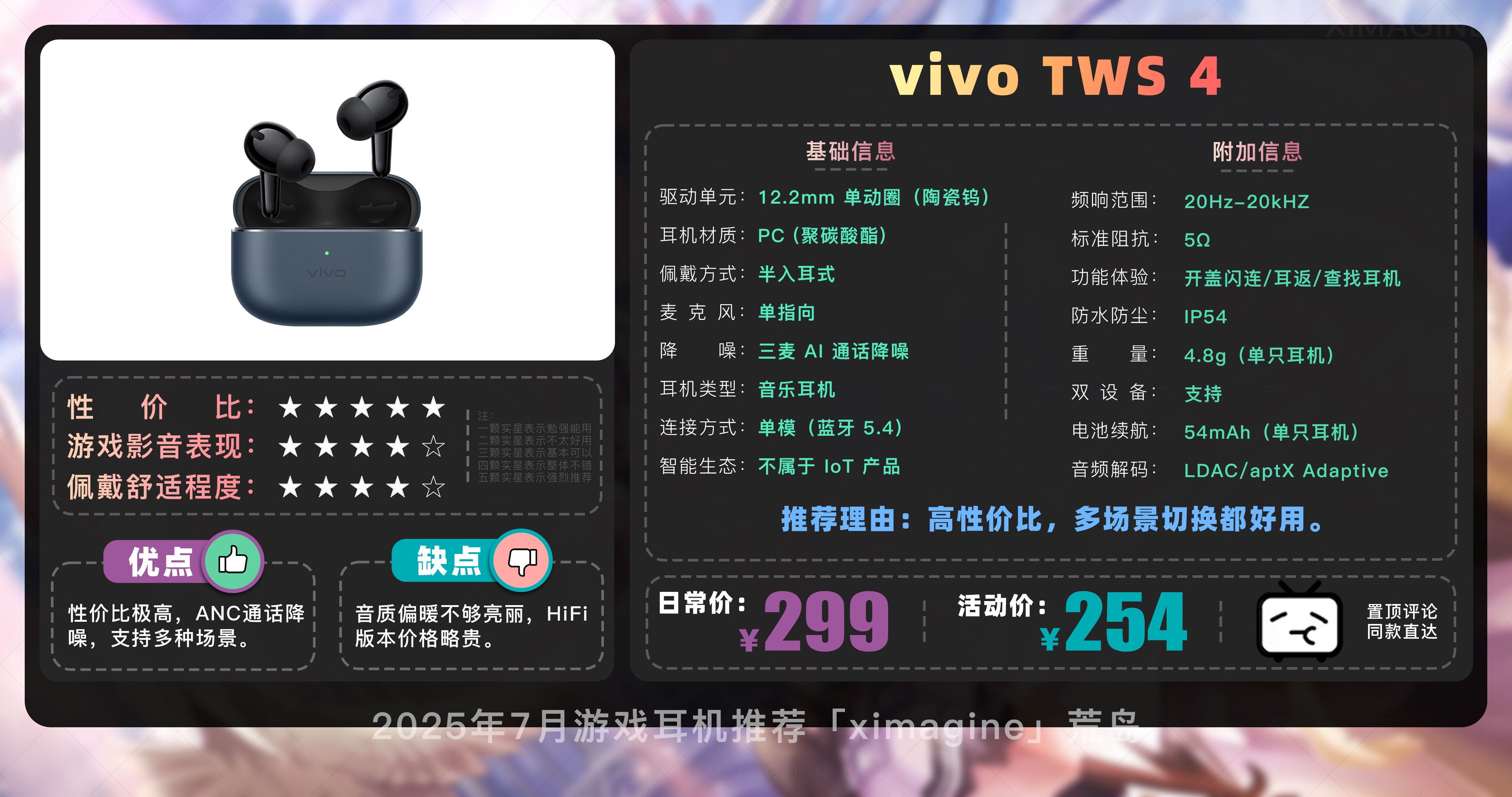 vivo TWS 4,采用陶瓷钨 12.2mm 单动圈,LDAC 和aptX Adaptive 音频解码器,单模蓝牙连接,设计轻巧且符合人体工学,佩戴几乎无感,适合长时间使用。它声音清晰透亮,高频细节丰富,中低频平衡,游戏时能准确传递脚步和环境声音,提升对战时的判断力。无线连接稳定,延迟表现良好,确保音画同步,尤其适合手游玩家。麦克风拾音清晰,通话时能够减少背景噪音,外观简洁现代,适合追求时尚用户,电池续航表现理想,配合便携充电盒,出门使用无忧。当前到手价 254 元,是性价比很高的无线耳机选择。