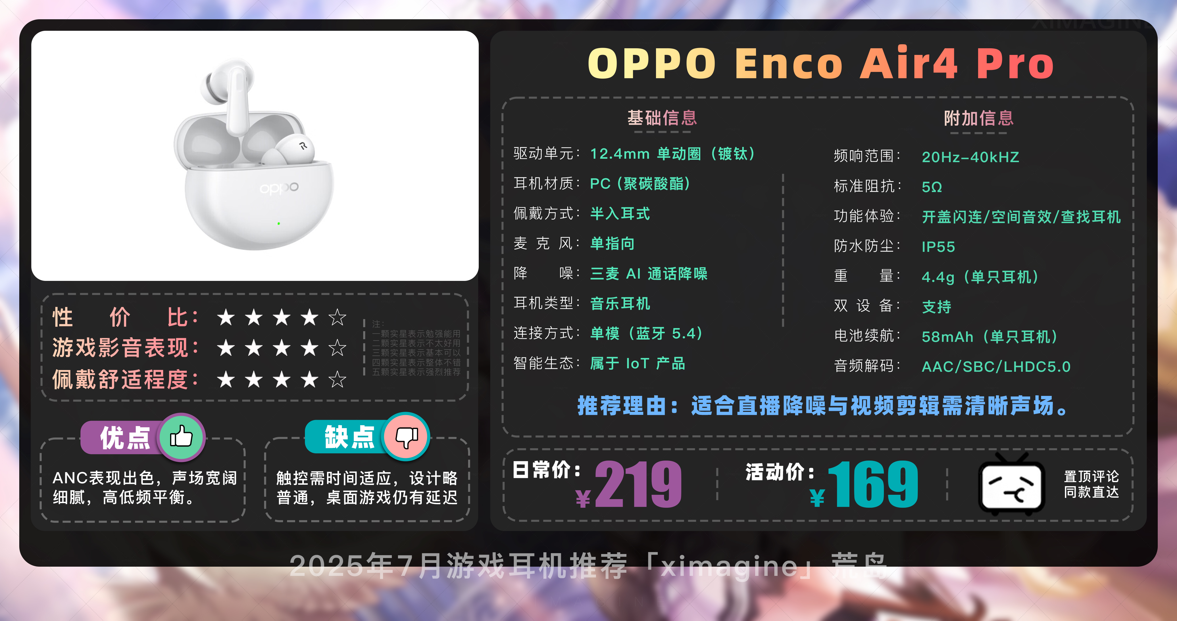 OPPO Enco Air4 Pro,采用镀钛振膜 12.4mm 单动圈,AAC 和 SBC 及 LHDC5.0 音频解码器,单模蓝牙连接,造型时尚,轻巧贴耳,佩戴感极佳,适合长时间游戏和通勤。声音表现均衡且细腻,高频通透,中频温暖柔和,低频适中不泛滥,适合多种游戏类型和音乐风格。无线连接流畅稳定,延迟极低,游戏体验顺畅无卡顿。它的麦克风搭配降噪技术,通话时能有效减少环境噪声,保证语音清晰,特别适合开黑时多人与队友沟通。耳机还支持触控操作,方便快捷。当前到手价 169 元,是注重音质和使用体验的好选择。
