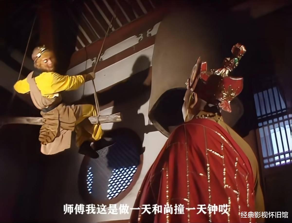 然后不由分说的跳上去,直接打起钟来,这下子惊动了全院的大小和尚和住持,纷纷过来看是怎么回事,唐僧也知道徒弟这下子闯祸了,连忙劝他停下来,这时孙悟空嘴里说了一句具像的话:我这是做一天和尚撞一天钟