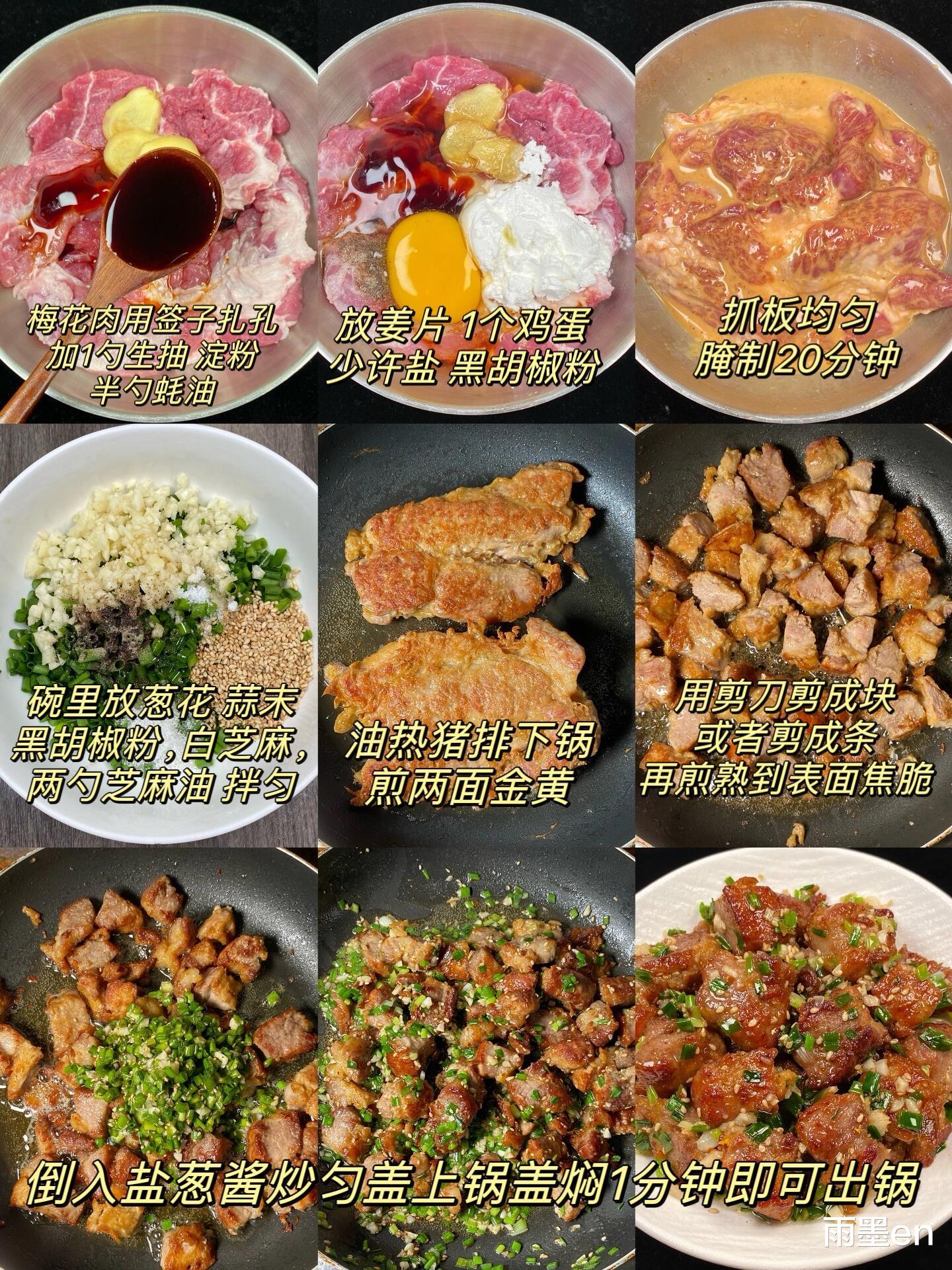 制作步骤分3步,25分钟就能上桌!第一步处理猪排:猪里脊肉洗净,用刀从中间片成厚度均匀的薄片(约0.8厘米),用肉锤或保鲜膜包裹后用勺子敲打,让肉质更疏松(敲打过的猪排更易入味,还能避免煎老)。放入碗中,加料酒、盐、黑胡椒粉、姜片、一半葱花和蒜末,抓匀腌制15分钟(去腥又入味,时间别省)。第二步裹粉煎制:腌制好的猪排挑出姜片,两面均匀拍上一层薄淀粉(抖掉多余的,避免煎的时候结块)。热锅冷油,油烧至六成热(手放锅上方能感觉到热气),放入猪排,中小火煎3分钟,直到一面金黄酥脆,翻面再煎2分钟,确保猪排熟透(用筷子能轻松戳透就好),捞出控油。第三步炒盐葱酱:锅中留少许底油,放入剩余的葱花和蒜末,小火翻炒1分钟,炒出浓郁的葱蒜香,加入半勺盐和少许黑胡椒粉,翻炒均匀后,淋在煎好的猪排上,即可装盘!