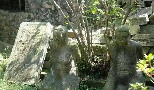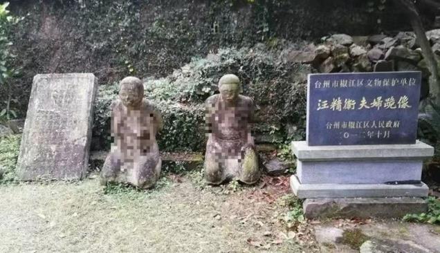 后来在梅花山观梅轩的那座跪像也被移走了,保管在了管理局景园中,照片中就是2012年十月时拍摄的画面,这对“汉奸夫妻”的跪像成为了台州市椒江区的文物保护单位。