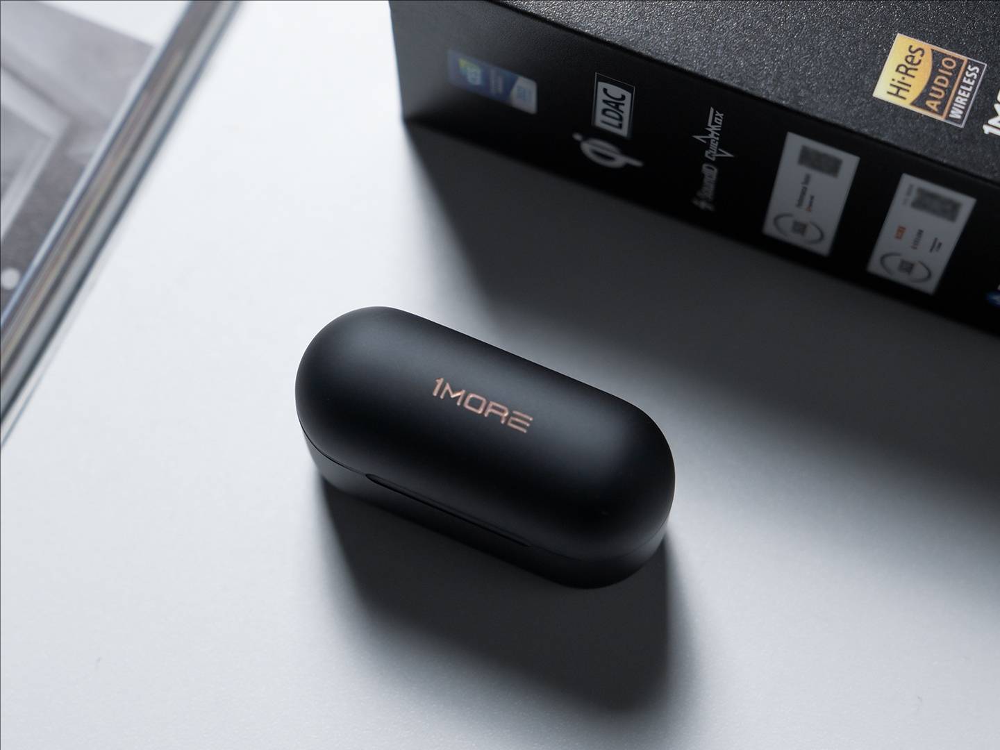 万魔新降噪豆1MORE EVO延续了简约质感风格,雪瓷白和鎏金黑两款配色沉稳大气。充电盒采用一体式磨砂设计,开口处还带有品牌LOGO磁扣,触感细腻,提升开箱仪式感。耳机本体是入耳式设计,陶瓷后盖不仅美观,还兼具触控功能,可轻松操作播放、接听电话和调节音量。整体造型贴合耳廓曲线,佩戴舒适,长时间佩戴也几乎感觉不到重量。
