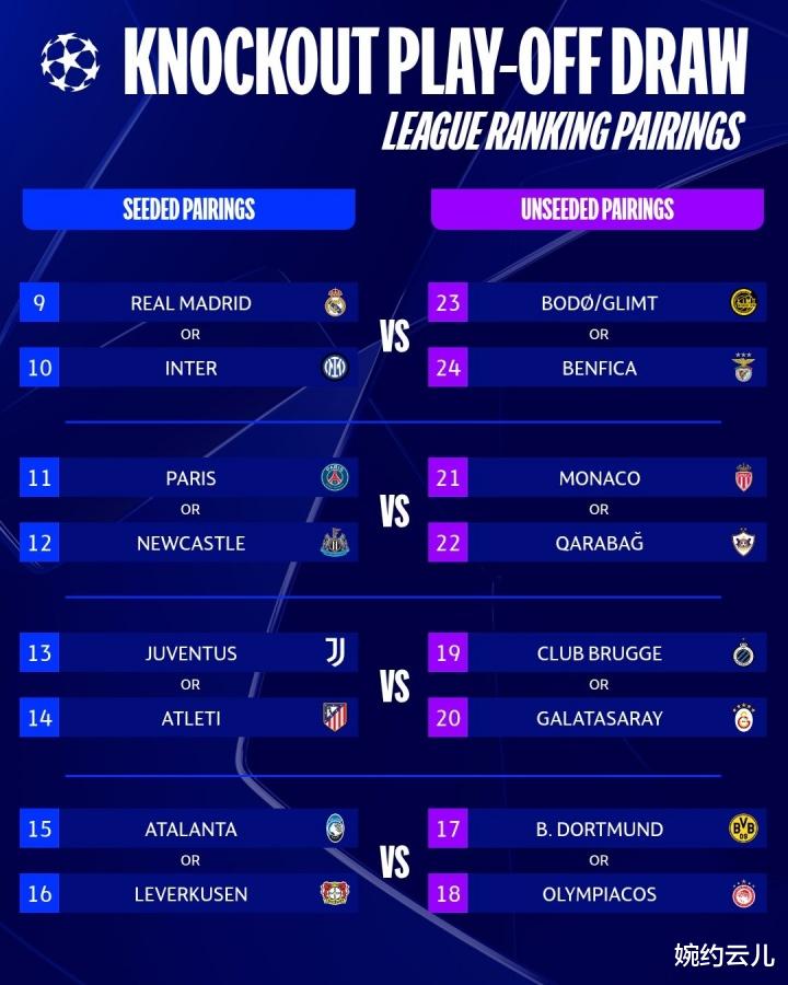 这次的参赛球队共16队,分别是联赛阶段第9-16名为种子队,17-24名为非种子队。种子队分别是皇马、国际米兰、巴黎圣日耳曼、纽卡斯尔联、尤文图斯、马德里竞技、亚特兰大、勒沃库森。非种子队 多特蒙德、奥林匹亚科斯、布鲁日、加拉塔萨雷、摩纳哥、卡拉巴赫、博德闪耀、本菲卡,可以看出强队都不想碰多特蒙德,其他球队相对要容易一些。