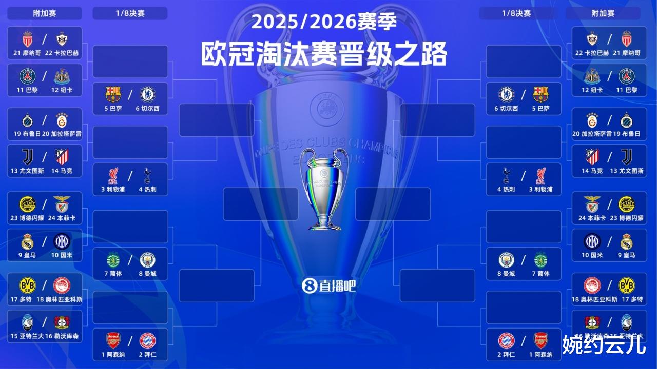 今晚19:00,2025-26 赛季欧冠淘汰赛附加赛抽签在瑞士尼翁举行,16队将通过两回合争夺8个1/8决赛席位,皇马与
