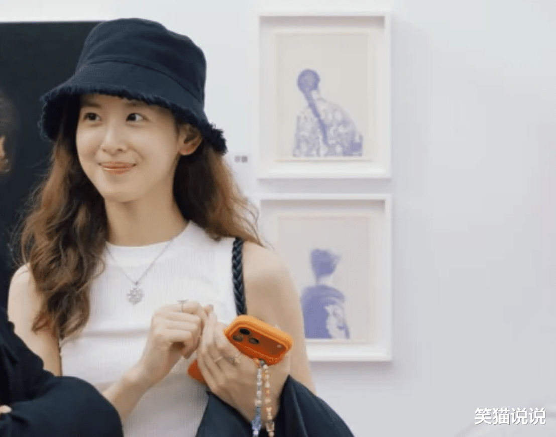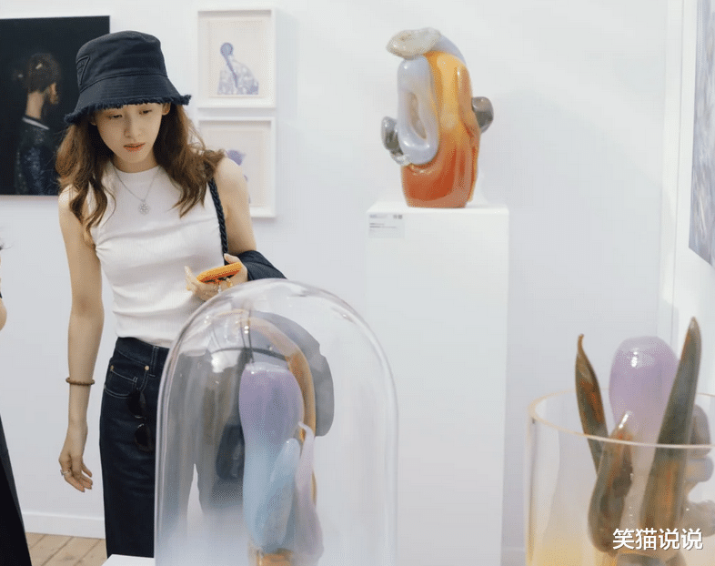 章泽天一边参观展览,一边与身边的友人聊天,时不时露出甜美的笑容。她低头仔细观看展出的作品,听着身边人的讲解,彼此都有说有笑的样子,氛围感很不错。