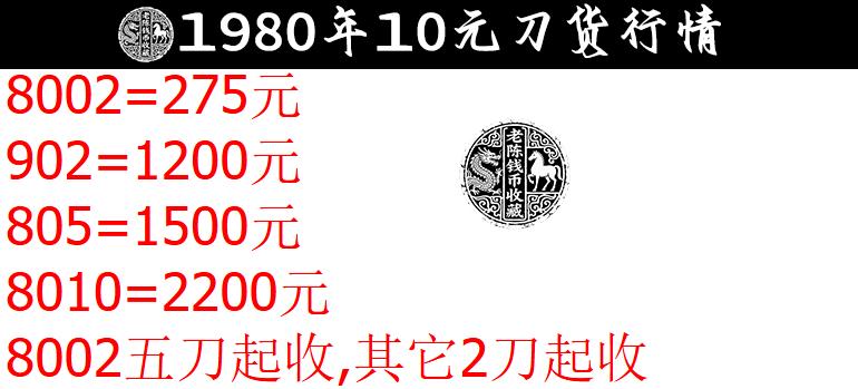从上面的图片中,可以看到,现在一整刀1980年10元纸币,市场报价在2200元左右,平均一张相当于22元,比单独的散张溢价高了不少。
