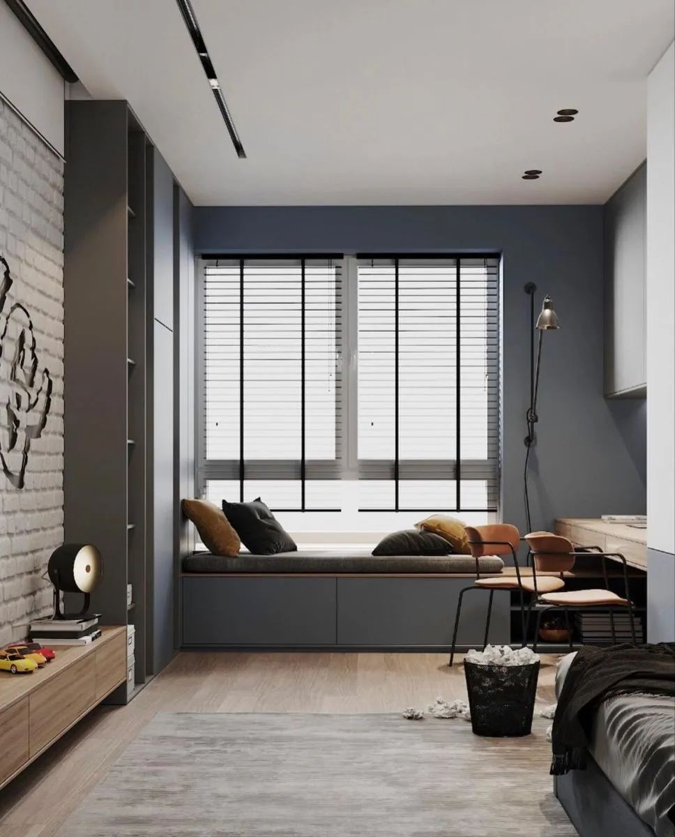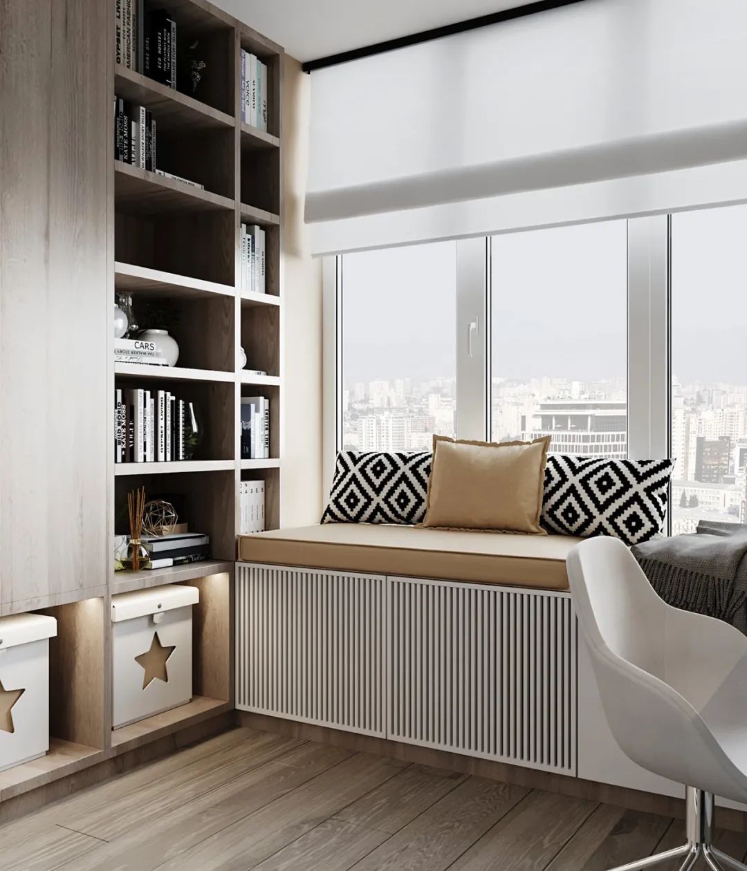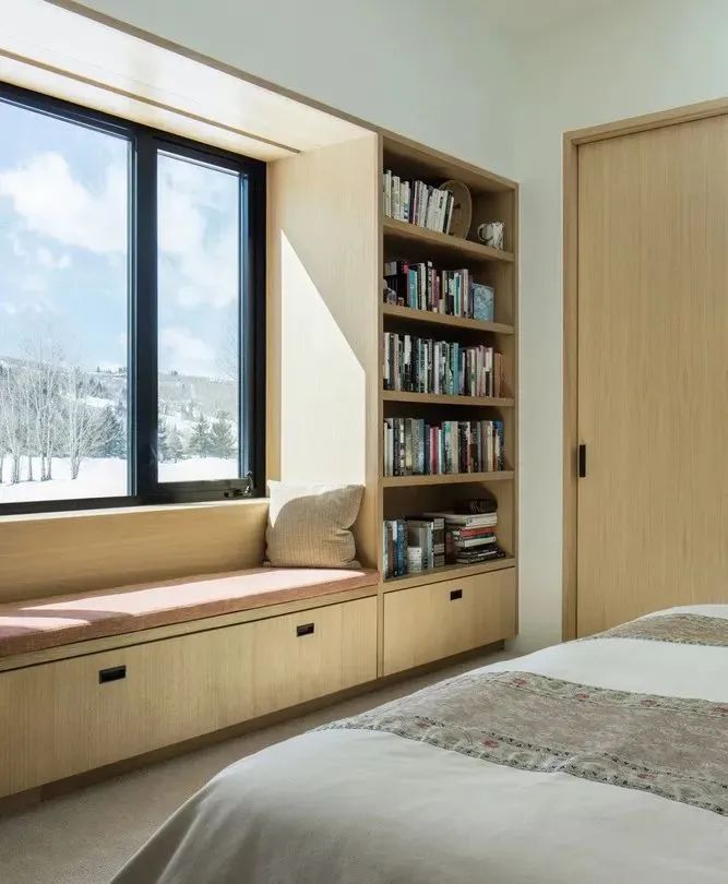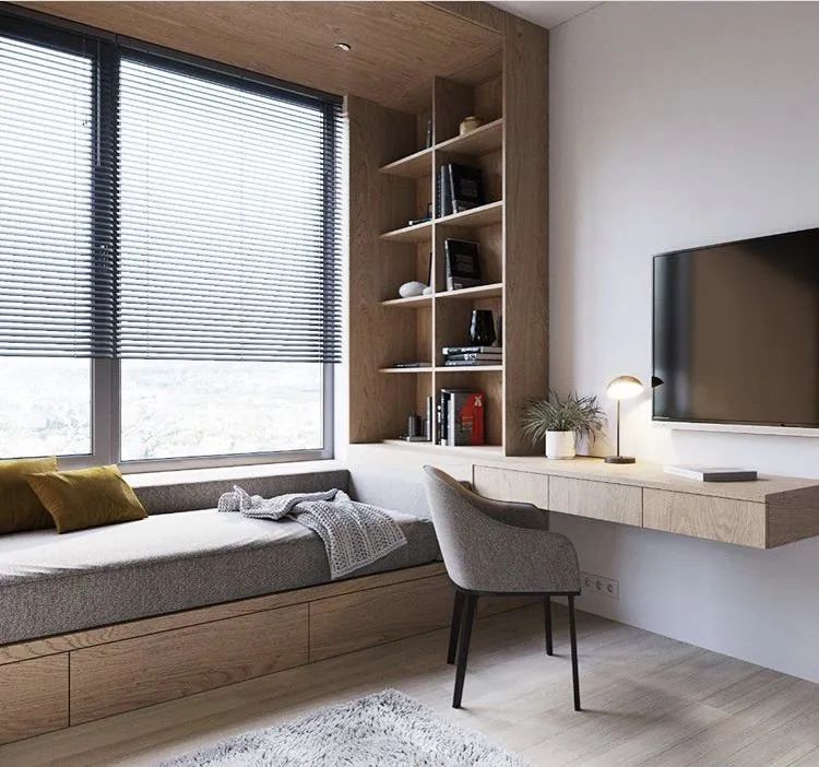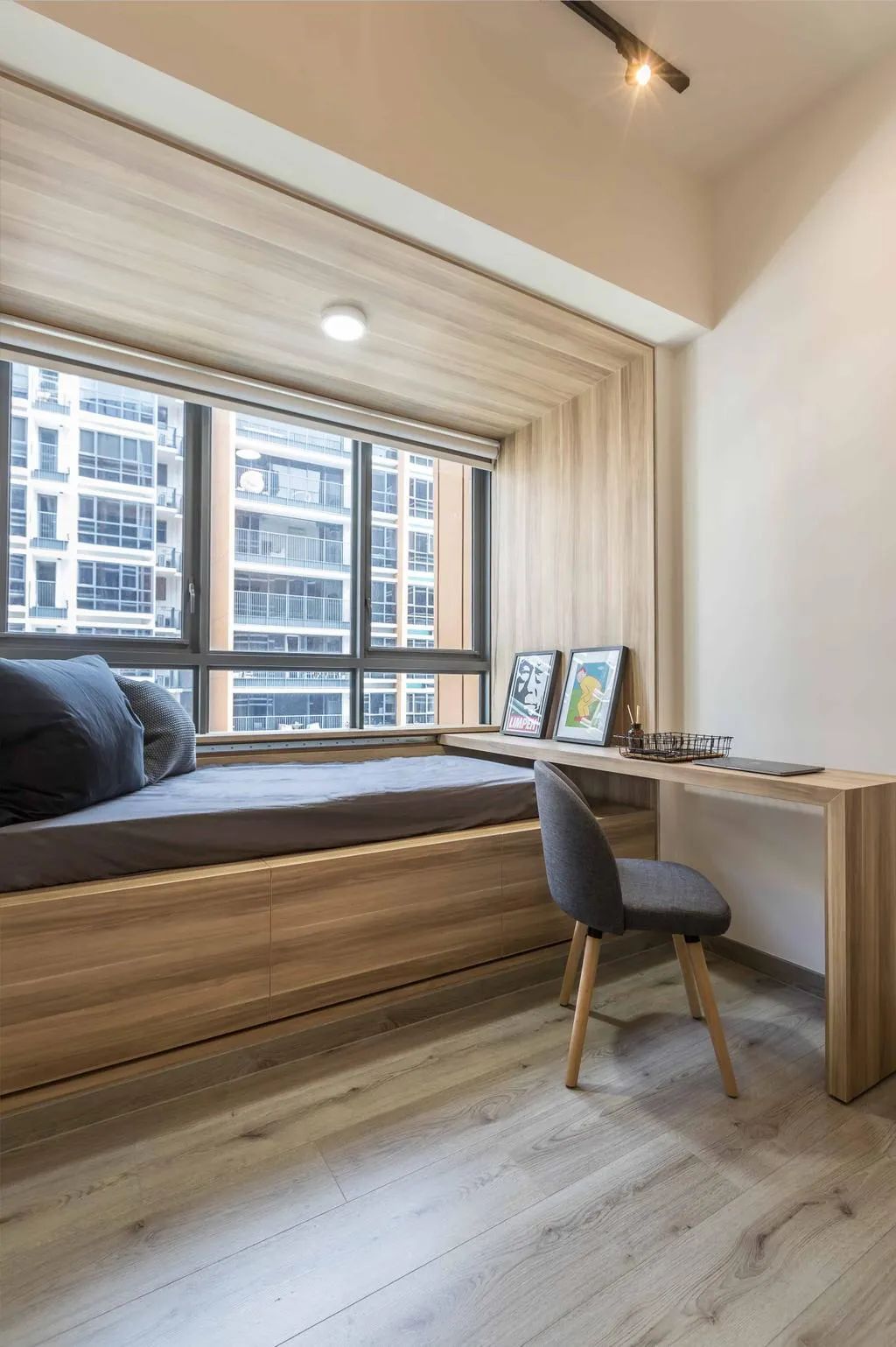 飘窗的设计既有利于进行大面积的玻璃采光,又保留了宽敞的窗台,使得室内空间在视觉上得以延伸。现在业主将卧室或客厅的凸窗变成了更实用的空间,例如用于额外存储的橱柜、平台床,书桌甚至梳妆台。