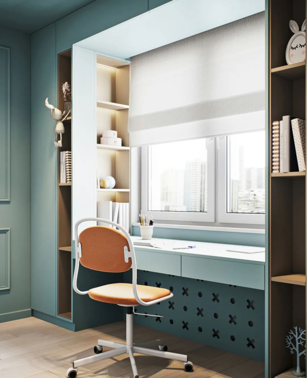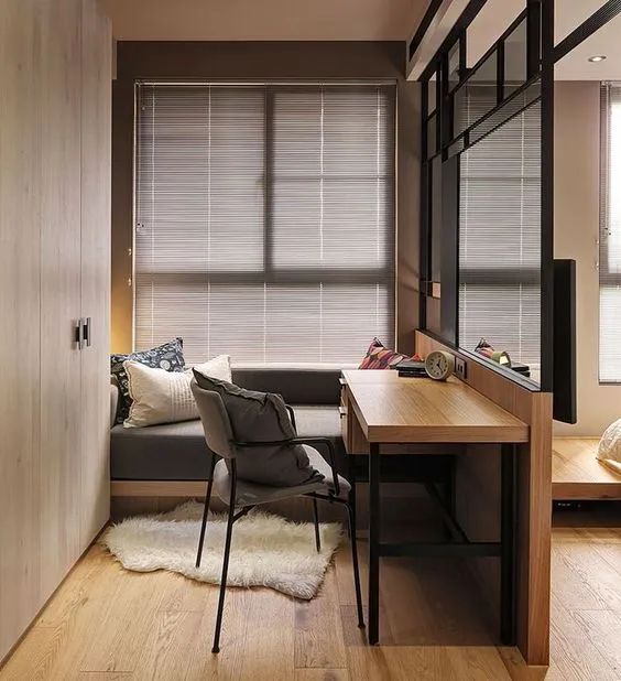 摆上书桌创造一个专属于你的小空间,如果壁架太窄或太低而无法工作,可以L 办公桌。或者,可以尝试一个多功能的二合一解决方案,将窗台分成座位区和办公桌区。