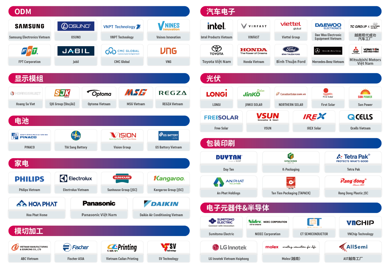 展会将集中吸引 ODM、显示模组、汽车电子、光伏、电池、包装印刷、模切加工、家电、电子元器件等九大领域的优质买家,预计越南及东南亚地区专业观众占比90%以上,为参展商搭建高质量、本土化的商贸对接平台,精准触达东盟核心采购群体。