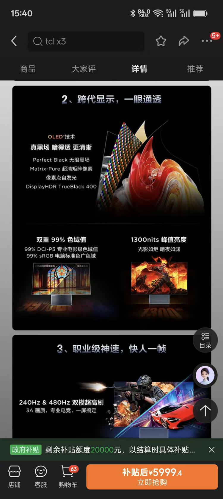 看了下电商详情页,这款TCL 32X3A显示器通过OLED+ 技术解决了OLED显示器的“文字彩边”问题,再加上双重99%色域值(DCI-P3和sRGB)和1300nits的峰值亮度,所以非常适合用来办公;而且因为它搭载了一块行业最高规格的4K 240Hz双模面板,能一键切换到480Hz超高刷,再加上配置了疾速帧技术,画质和刷新率都是顶级,所以用来打专业电竞也是绰绰有余;其他的比如B&O的音响系统,独立声学芯片,硬件低蓝光护眼,以及行业最高屏占比、6.4mm线薄机身,真的是让人看得越看越心动!