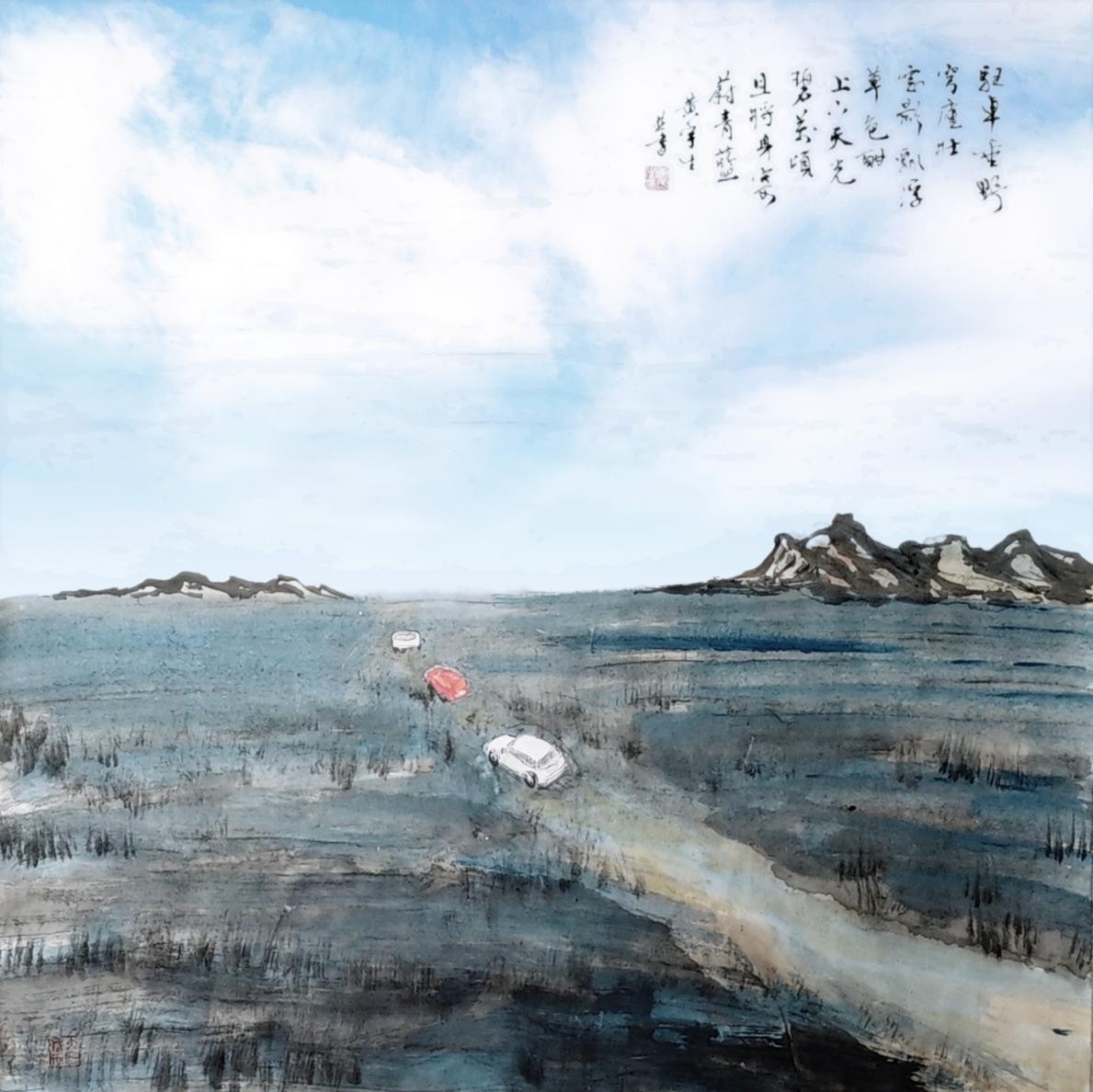 驱车垂野穹庐壮,云影飘浮草色酣,上下天光碧万顷,且将身寄蔚青蓝~自撰