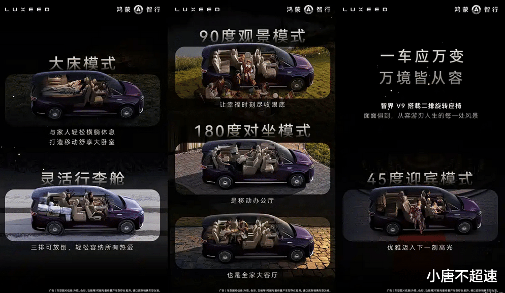 点评:智界V9座舱内采用天然实木饰板与NAPPA头层真皮的组合,搭配水晶旋钮和一体式贯穿屏幕,整体用料与科技配置处于当前MPV市场的主流偏上水平。二排旋转座椅支持多角度调节与多种场景模式,从45度迎宾到180度对坐,覆盖商务接待、家庭出行、临时休憩等实际使用场景。同时二排座椅还配备了环抱式安全气囊,在被动安全层面做了针对性设计。第三排靠背可完全放平,提升了后备厢空间的灵活性。